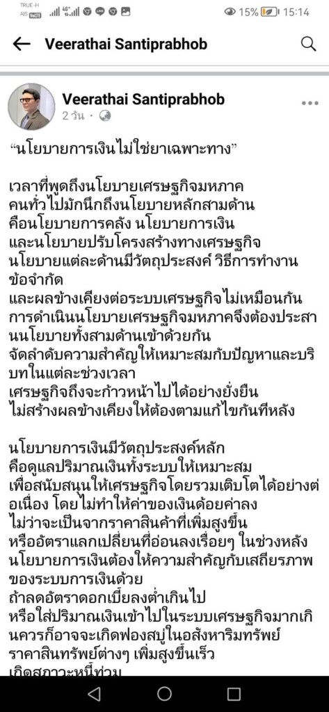 นายวิรไท สันติประภพ อดีตผู้ว่าการธนาคารแห่งประเทศไทย (ธปท.) โพสต์เฟซบุ๊ก ระบุ เศรษฐกิจไทยมีปัญหาที่โครงสร้าง “นโยบายการเงิน” เป็นเพียงแค่ “น้ำเกลือ” แนะควรให้ความสำคัญกับ “นโยบายกระจายสภาพคล่องทางการเงิน” มากกว่า “นโยบายการเงิน”