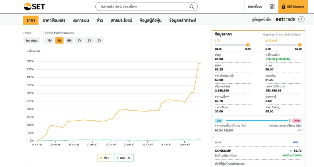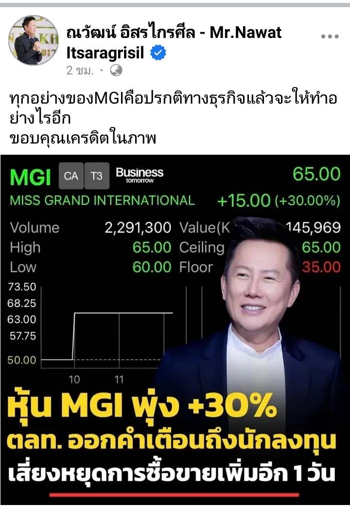 กรุงเทพฯ 27 ก.พ.-ราคาหุ้น บริษัท มิสแกรนด์ อินเตอร์เนชั่นแนล จำกัด (มหาชน) หรือ MGI ล่าสุดราคาปรับเพิ่มขึ้นทะลุ 65 บาท แม้ ตลาดหลักทรัพย์ฯ จะควบคุมด้วยมาตรการควบคุมการซื้อขายระดับที่ 3 และพักการซื้อขายด้วยเครื่องหมาย P มาแล้ว 2 ครั้งแล้ว จากสภาพการซื้อขายปรับตัวเพิ่มขึ้นอย่างมากในเวลาอันสั้น เกินปัจจัยพื้นฐานของบริษัท