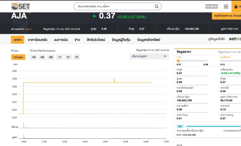 ราคาหุ้น MGI วันนี้แตะ 65.00 บาท เพิ่มขึ้น 15.00 บาท หรือ +30% ทำให้อัตราส่วน P/E ขึ้นไปมากกว่า 114 เท่า ส่วนราคาหุ้นบริษัท เอเจ แอดวานซ์ เทคโนโลยี จำกัด (มหาชน) หรือหุ้น AJA ปิดที่ 0.37 บาท เพิ่มขึ้น 0.08 บาท หรือ 27.59% ทั้งสองตัวปรับตัวเพิ่มขึ้นทำจุดสูงสุดของวัน (Ceiling) โดย บอร์ด AJA แต่งตั้ง นายณวัฒน์ อิสรไกรศีล เป็นกรรมการบริษัท ซึ่ง นายณวัฒน์ เป็นผู้ถือหุ้นใหญ่อันดับที่ 4 ถือหุ้นกว่า 200 ล้านหุ้น พร้อมระบุว่าจะเข้ามาช่วยปรับกลยุทธ์ของ AJA บุกตลาดอาหารเสริม กลุ่มสินค้านวัตกรรมชะลอวัย