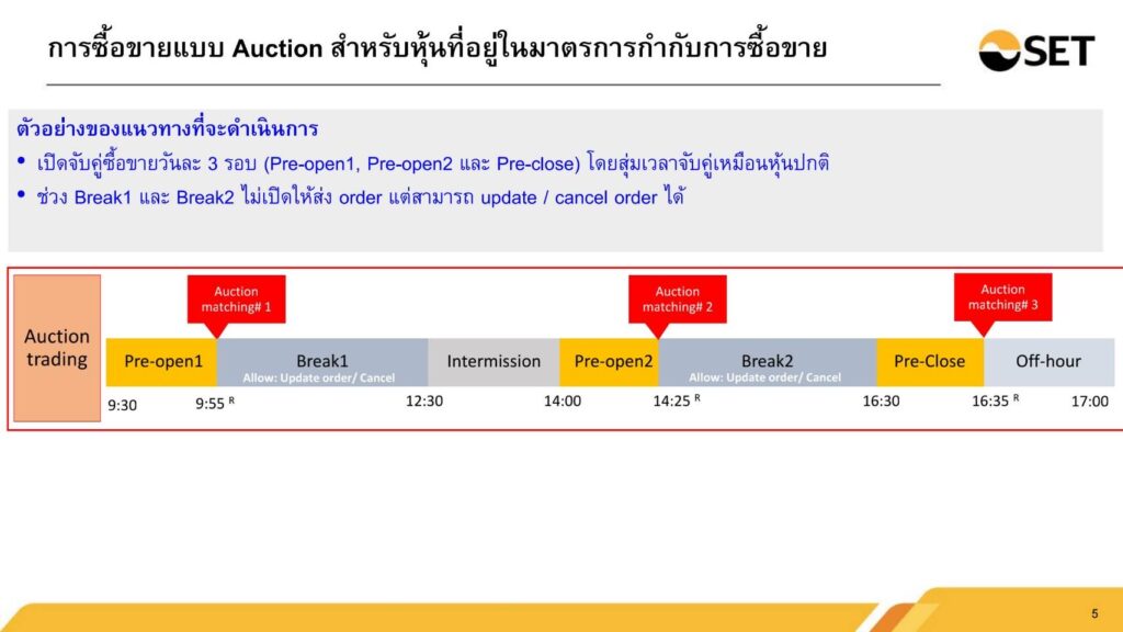 สำหรับระบบ Auction เป็นระบบเดียวกับที่ซื้อขายหุ้นใน Live Platform ที่จะนำมาให้ซื้อขาย จะเป็นการเปิดให้มีการซื้อขายได้ 3 ครั้งต่อวัน คือ ในรอบเช้า 09.55 น. รอบเที่ยง 14.25 น. และรอบเย็น 16.35 น. ซึ่งตลาดหลักทรัพย์อยู่ระหว่างการพิจารณาว่า การใช้ Auction ในการซื้อขายควรกำหนดว่าใช้ตอนไหน จะต้องรอให้มาตรการควบคุมหุ้นร้อนแรง T1 – T3 ก่อนแล้วค่อนใช้ Auction หรือ จะใช้มาตรการนี้ควบคู่กันไปกับมาตรการปกติ