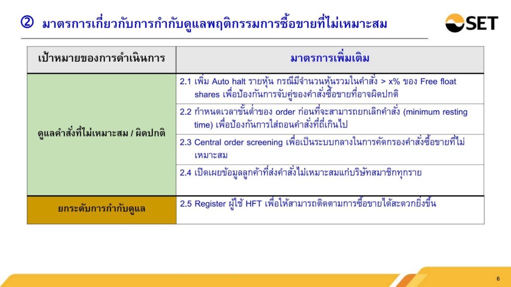 ส่วนที่ 2 มาตรการเกี่ยวกับการกำกับดูแลพฤติกรรมการซื้อขายที่ไม่เหมาะสม ทั้งการเพิ่มระบบ Auto Halt รายหุ้นในกรณีที่มีจำนวนหุ้นรวมในคำสั่ง ตามเงื่อนไขที่กำหนด รวมถึงการ เปิดเผยข้อมูลลูกค้าที่ส่งคำสั่งไม่เหมาะสมแก่บริษัทสมาชิกทุกรวม และการลงทะเบียน ผู้ใช้โปรแกรมเทรดความเร็วสูง หรือ HFT เพื่อให้สามารถติดตามการซื้อขายได้สะดวกมากขึ้น