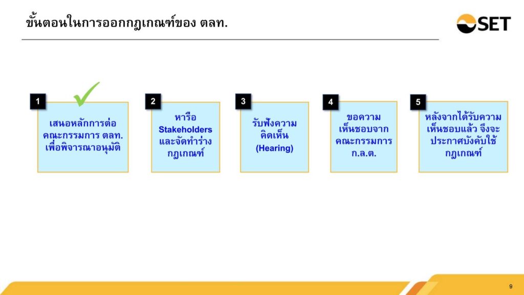ในขั้นตอนต่อไปตลาดหลักทรัพย์ฯ จะดำเนินการจัดให้มีการรับฟังความคิดเห็น (Hearing) จากผู้เกี่ยวข้อง พร้อมทั้งจะนำไปปรึกษาหารือร่วมกับสำนักงานคณะกรรมการกำกับหลักทรัพย์และตลาดหลักทรัพย์ (ก.ล.ต.) อย่างใกล้ชิด ก่อนที่จะนำเสนอต่อสำนักงาน ก.ล.ต. เพื่อพิจารณาอนุมัติ ซึ่งเป็นไปตามขั้นตอนทางกฎหมายที่กำหนดไว้.-511-สำนักข่าวไทย