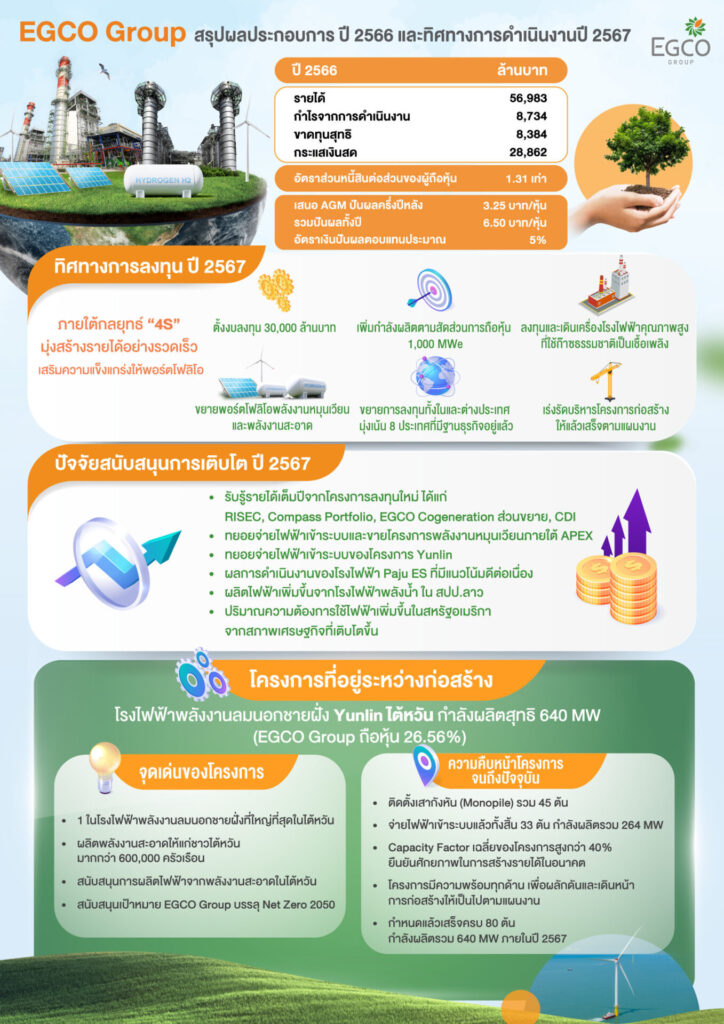 สำหรับผลประกอบการในปี 2566 EGCO Group มีรายได้รวม 56,983 ล้านบาท และมีกำไรจากการดำเนินงาน 8,734 ล้านบาท โดยปัจจัยสนับสนุนหลักมาจากโรงไฟฟ้า Paju ES และ Linden Cogen ซึ่งสามารถทำกำไรได้อย่างโดดเด่นต่อเนื่อง และโรงไฟฟ้า BLCP ที่มีปริมาณการขายไฟฟ้าเพิ่มขึ้น อย่างไรก็ตาม EGCO Group มีขาดทุนสุทธิ 8,384 ล้านบาท สาเหตุหลักจากการปรับโครงสร้างทางการเงินและการถือหุ้นของโครงการ Yunlin ซึ่งเป็นรายการทางบัญชีที่ไม่กระทบกระแสเงินสดและไม่กระทบอัตราส่วนทางการเงินตามเงื่อนไขสัญญาเงินกู้ ทั้งนี้ ณ สิ้นปี 2566 EGCO Group มีเงินสดและรายการเทียบเท่าเงินสด 28,862 ล้านบาท และอัตราส่วนหนี้สินต่อส่วนของผู้ถือหุ้นอยู่ที่ 1.31 เท่า ซึ่งอยู่ในระดับที่แข็งแกร่ง