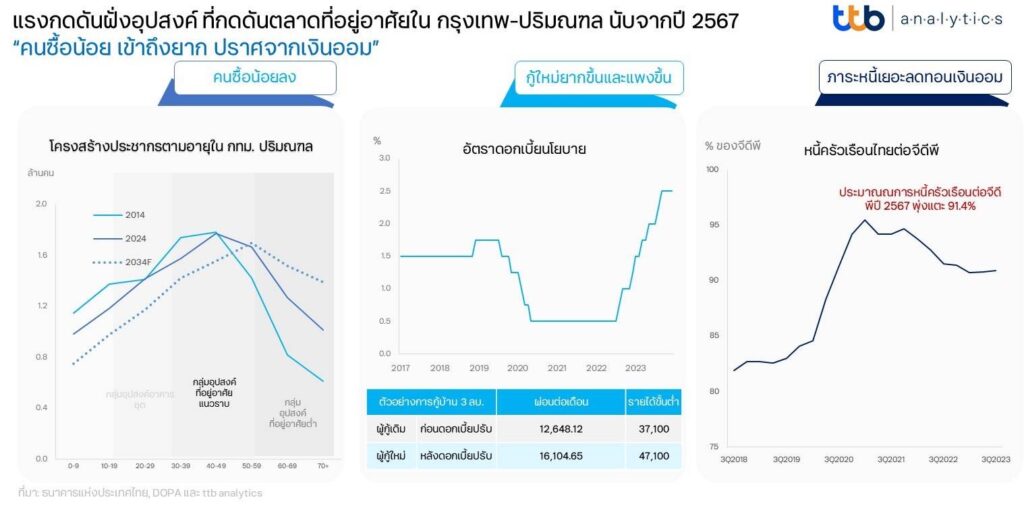 ttb analytics มองปี 2567 อาจเป็นปีที่มูลค่าการโอนที่อยู่อาศัยในกรุงเทพฯ และปริมณฑลมีระดับต่ำสุดในรอบ 7 ปี (ไม่นับช่วงปี 2564 ที่สถานการณ์โควิด-19 มีการแพร่ระบาดใหญ่ในไทย) ที่มูลค่าการโอนคาดอยู่ราว 6.0 แสนล้านบาท ด้วยหน่วยโอนที่อยู่อาศัยที่คาดต่ำสุดนับจากปี 2561 ที่ 1.64 แสนหน่วย ซึ่งสัญญาณการชะลอตัวในปี 2567 เมื่อมองออกไปในระยะกลางอีก 1-3 ปีข้างหน้า ทาง ttb analytics มองตลาดที่อยู่อาศัยในกรุงเทพฯ และปริมณฑลมีแรงกดดันฝั่งอุปสงค์ ที่กดดันตลาดที่อยู่อาศัยในกรุงเทพฯ และปริมณฑล นับจากปี 2567 ที่ลดทอนแรงหนุนฝั่งกำลังซื้อลง อาจสรุปเป็นคำสั้น ๆ คือ “คนซื้อน้อย เข้าถึงยาก ปราศจากเงินออม” หรือขยายความในเชิงบริบทคือ 1) คนซื้อจะน้อยลง 2) คนเข้าถึงสินเชื่อจะยากขึ้น และ 3) คนไม่มีเงินออมที่มากเพียงพอ