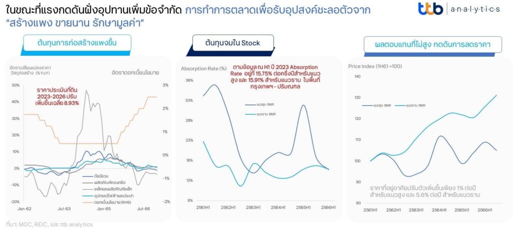 ขณะที่ฝั่งอุปทานก็ไม่สามารถทำการตลาดเพื่อช่วยให้สถานการณ์ของตลาดที่อยู่อาศัยดีขึ้นมาได้จากสถานการณ์ “สร้างแพง ขายนาน รักษามูลค่า” เนื่องจาก ต้นทุนค่าก่อสร้างและต้นทุนการเงินที่เพิ่มขึ้น ต้นทุนคงค้างที่บนกำลังซื้อของคนในปัจจุบันจะต้องใช้เวลาเกือบ 3 ปีครึ่งจึงจะระบายสต๊อกที่อยู่อาศัยคงค้างได้หมด แลัราคาที่ต้องคงไว้เพื่อรักษาภาพลักษณ์การเป็นสินทรัพย์ที่รักษามูลค่าในตัวเอง