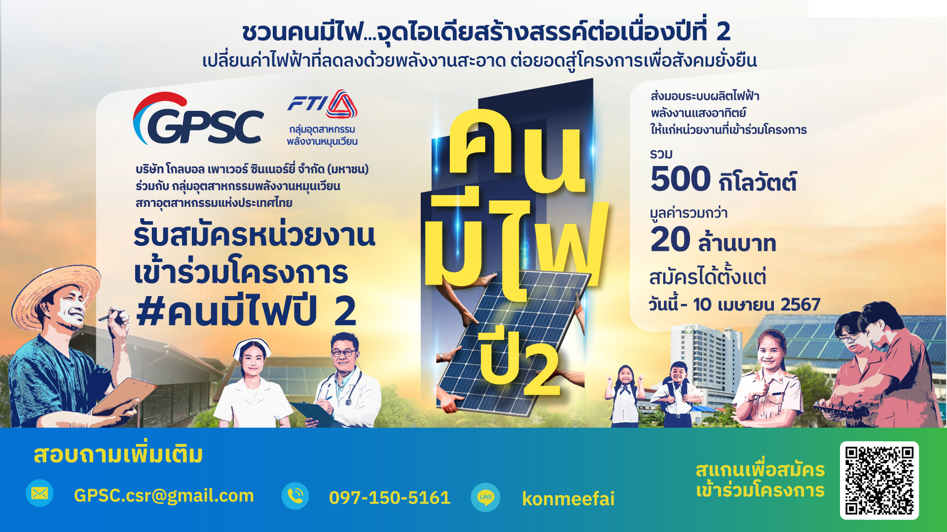 สำหรับโครงการ “คนมีไฟ” ปีที่ 2 เปิดรับสมัครหน่วยงานเข้ารับคัดเลือก โดยต้องเป็นหน่วยงานด้านการศึกษา หน่วยงานด้านสาธารณสุข หน่วยงานด้านทรัพยากรธรรมชาติและสิ่งแวดล้อม หรือหน่วยงานที่ไม่แสวงหาผลกำไร โดยมีขนาดการติดตั้งไม่เกิน 30 กิโลวัตต์ต่อแห่ง ผู้ผ่านการคัดเลือกต้องจัดทำโครงการนำค่าใช้จ่ายไฟฟ้าที่ลดลงต่อเดือนไปใช้พัฒนาชุมชนโดยรอบอย่างยั่งยืน หน่วยงานหรือองค์กรใดที่ผ่านเกณฑ์ข้างต้น สามารถติดต่อขอข้อมูลเพิ่มเติมได้ผ่านช่อทางดังต่อไปนี้ Email: gpsc.csr@gmail.com หรือ Tel/Line-id: 097-150-5161 ระหว่างวันที่ 1 มีนาคม – 10 เมษายน 2567 นี้ โดยจะทำการคัดเลือกและประกาศผลภายในวันที่ 1 พฤษภาคม 2567 หลังจากนั้นจะมีการลงพื้นที่สำรวจหน่วยงานที่ได้รับการคัดเลือก และคาดว่าจะสามารถติดตั้งแล้วเสร็จภายในเดือนธันวาคม 2567