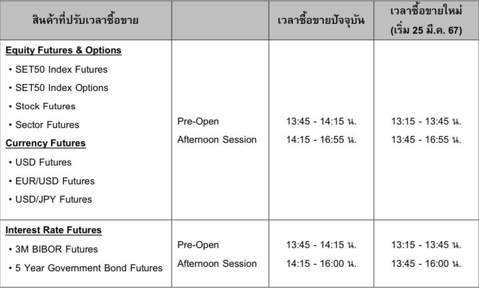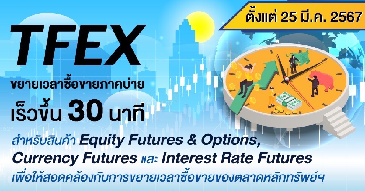 บริษัท ตลาดสัญญาซื้อขายล่วงหน้า (ประเทศไทย) จำกัด (มหาชน) (TFEX) เตรียมขยายเวลาทำการซื้อขายในช่วงกลางวันสำหรับสินค้ากลุ่ม Equity Futures & Options, Currency Futures และ Interest Rate Futures โดยจะเปิดทำการซื้อขายช่วงบ่าย (Afternoon Session) ให้เร็วขึ้น 30 นาที เพื่อให้สอดคล้องกับการขยายเวลาซื้อขายของตลาดหลักทรัพย์ฯ โดยช่วงเวลาที่มีการปรับใหม่จะมีผลตั้งแต่วันที่ 25 มีนาคม 2567 เป็นต้นไป ดังนี้