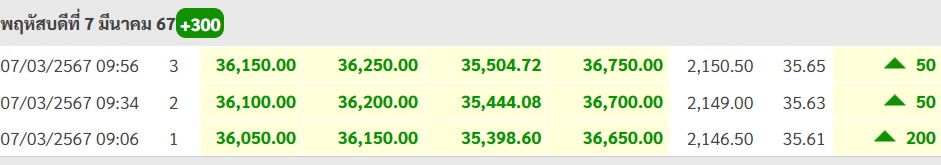 สมาคมค้าทองคำรายงาน ราคาทองคำเปิดเช้านี้ไม่ถึง 1 ชั่วโมง ราคาปรับเปลี่ยน 3 รอบ ปรับเพิ่มขึ้นรวม 300 บาท/บาททองคำ โดยรอบที่ 3 (09.56 น.) ราคาทำนิวไฮ สร้างสถิติสูงสุด โดยราคาทองคำแท่ง ขายออกบาทละ 36,250 บาท รับซื้อ 36,150 บาท ทองคำรูปพรรณ ขายออก 36,750 บาท รับซื้อ 35,504.72 บาท ตามราคาทองคำเอเชียที่ขยับขึ้นทำนิวไฮที่ 2,150 ดออลาร์สหรัฐ/ออนซ์ และอัตราแลกเปลี่ยนเงินบาทที่ 35.65 บาท/ดอลลาร์สหรัฐ