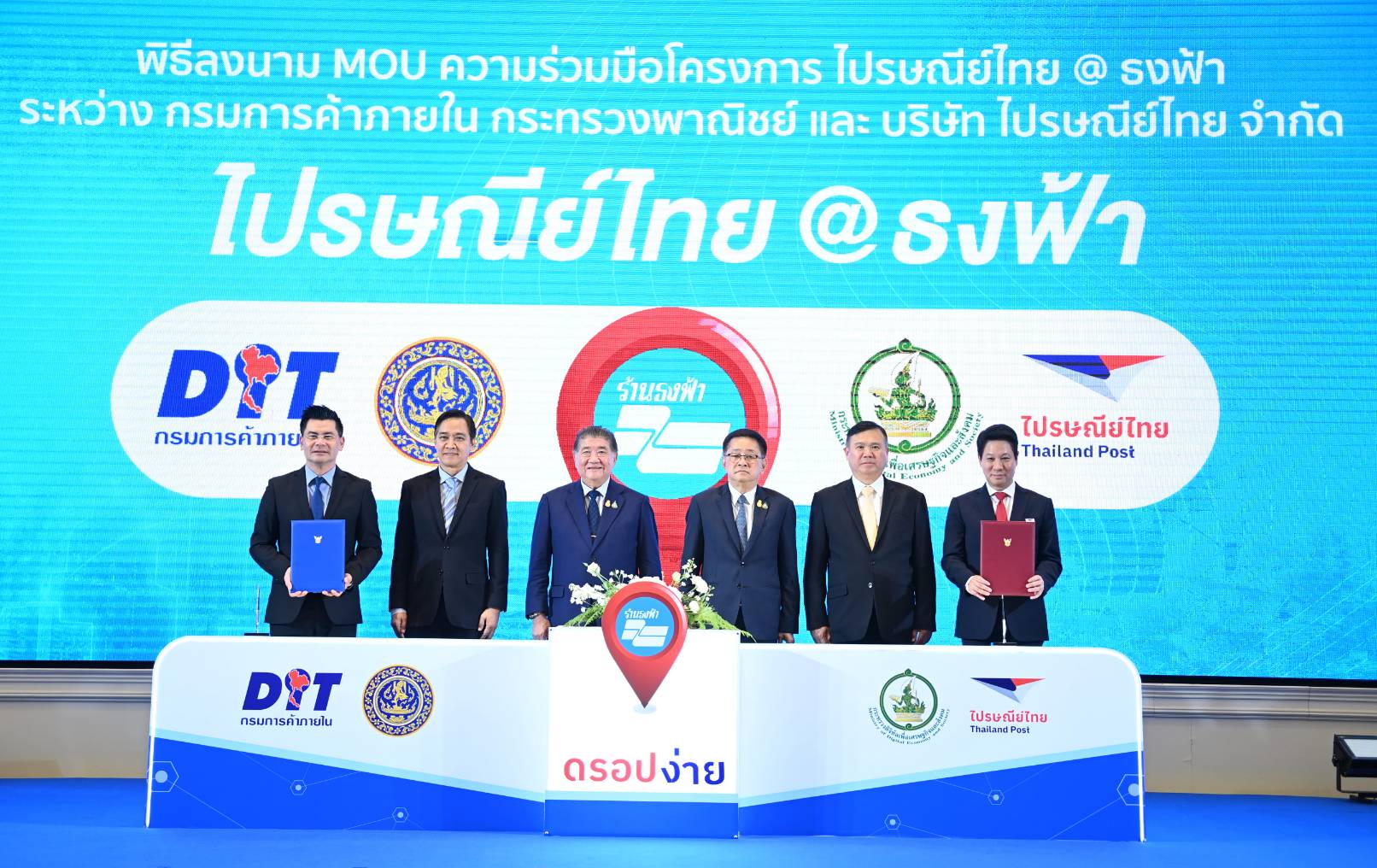 นายภูมิธรรม เวชยชัย รองนายกรัฐมนตรีและรัฐมนตรีว่าการกระทรวงพาณิชย์ พร้อมด้วยนายประเสริฐ จันทรรวงทอง รัฐมนตรีว่าการกระทรวงดิจิทัลเพื่อเศรษฐกิจและสังคม เป็นสักขีพยานในพิธีลงนาม MOU ความร่วมมือโครงการไปรษณีย์ไทย @ธงฟ้า ระหว่างกรมการค้าภายใน กระทรวงพาณิชย์ และบริษัท ไปรษณีย์ไทย จำกัด เพื่อขยายจุดให้บริการของไปรษณีย์ไทยสู่ร้านธงฟ้ากว่า 20,000 สาขาทั่วประเทศ ช่วยอำนวยความสะดวกพี่น้องประชาชน พ่อค้าแม่ค้าออนไลน์ในการเพิ่มช่องทางในการดรอปหรือส่งสินค้าผ่านร้านธงฟ้าและลดภาระค่าใช้จ่าย โดยมีนายกีรติ รัชโน ปลัดกระทรวงพาณิชย์ นายวัฒนศักย์ เสือเอี่ยม อธิบดีกรมการค้าภายใน และ ดร.อนันท์ สุภัทรพันธุ์ กรรมการผู้จัดการใหญ่ บริษัท ไปรษณีย์ไทย จำกัด ร่วมด้วย