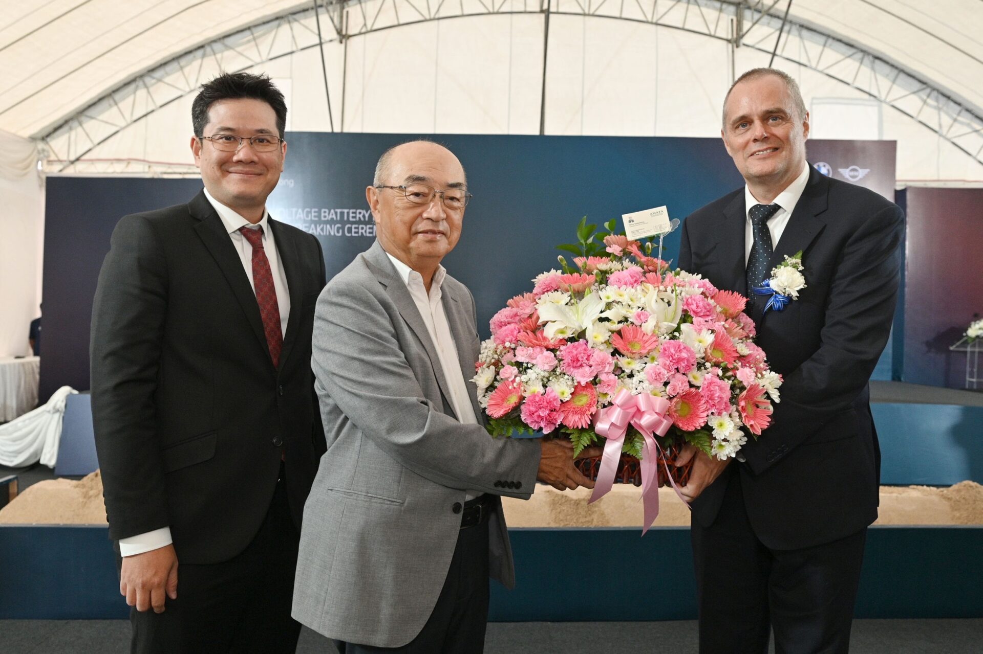 นายชิโร ซาโดชิมะ ที่ปรึกษากิตติมศักดิ์ พร้อมด้วยนายสัทธา วนลาภพัฒนา รักษาการประธานเจ้าหน้าที่กลยุทธ์ บริษัท อมตะ คอร์ปอเรชัน จํากัด (มหาชน) ร่วมแสดงความยินดีกับ นายเอริค รูเก้อ กรรมการผู้จัดการ โรงงานระยอง บริษัท บีเอ็มดับเบิลยู แมนูแฟคเจอริ่ง (ประเทศไทย) จำกัด ในพิธีเปิดหน้าดินอาคารสายการผลิตแบตเตอรี่สำหรับรถยนต์ไฟฟ้า BMW แห่งแรกในอาเซียน ณ นิคมอุตสาหกรรมอมตะซิตี้ ระยอง