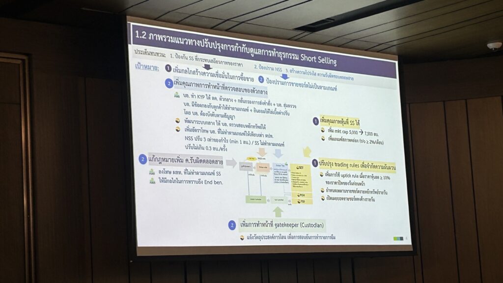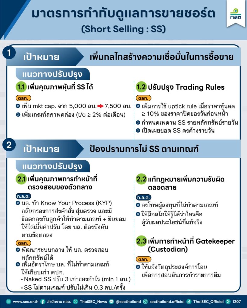 นางพรอนงค์ บุษราตระกูล เลขาธิการ ก.ล.ต. เปิดเผยถึงความคืบหน้า แนวทางปรับปรุงการกำกับดูแลธุรกรรม Short Selling และ Program Trading หรือ การใช้คอมพิวเตอร์ส่งคำสั่งซื้อขาย สำหรับแนวทางปรับปรุงการกำกับดูแลธุรกรรม Short Selling โดยเป้าหมายที่ 1 คือ เพิ่มกลไกสร้างความเชื่อมั่นในการซื้อขาย ซึ่งเพิ่มคุณภาพหุ้นที่สามารถ Short Selling (Eligible Securities) โดยเพิ่มเงื่อนไขของหุ้นกลุ่ม Non-SET100 ที่สามารถขายชอร์ตได้ โดยเพิ่มมูลค่าหลักทรัพย์ตามราคาตลาด (market capitalization) จาก 5,000 ล้านบาท เป็น 7,500 ล้านบาท และเพิ่มเกณฑ์สภาพคล่องของหุ้น (turnover) เป็นไม่น้อยกว่า 2%ต่อเดือน และจะมีการปรับปรุงเกณฑ์ซื้อขายของตลาดหลักทรัพย์ (trading rules) โดยเพิ่มการใช้ราคาขายชอร์ตที่ต้องสูงกว่าราคาซื้อขายครั้งสุดท้าย (Uptick Rule) เมื่อราคาหุ้นลดลงตั้งแต่ 10% ขึ้นไปของราคาปิดวันก่อนหน้า