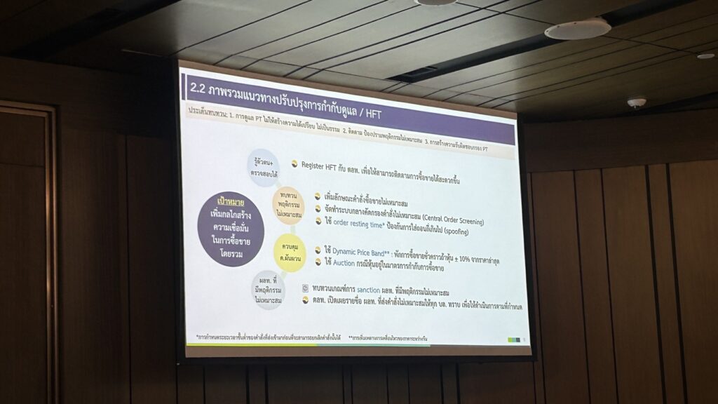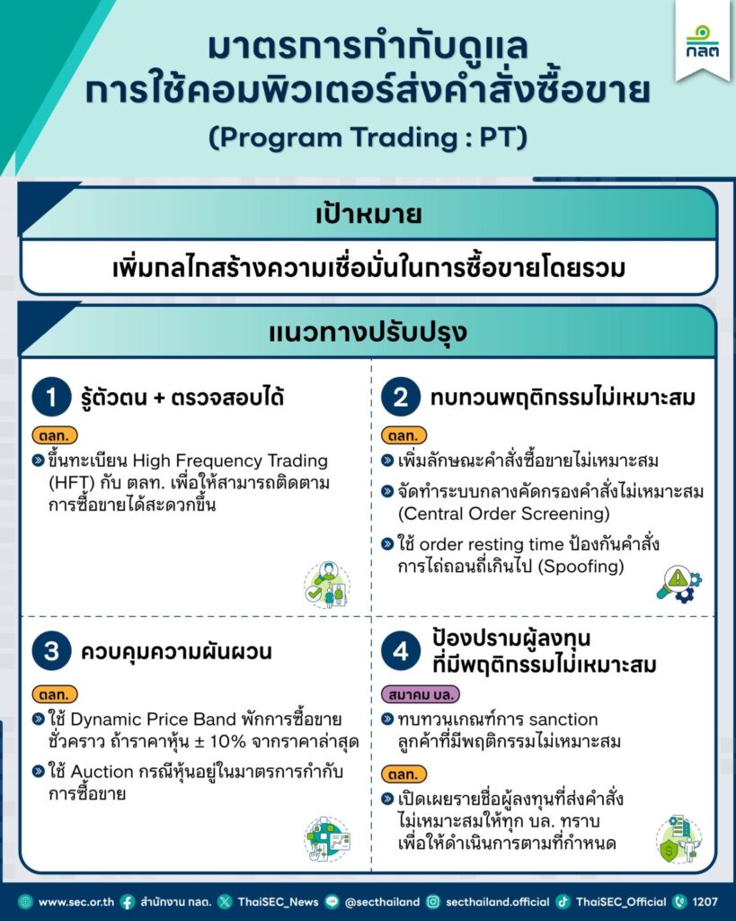 สำหรับแนวทางปรับปรุงการกำกับดูแลการใช้คอมพิวเตอร์ส่งคำสั่งซื้อขาย (Program Trading) / การส่งคำสั่งด้วยความเร็วสูง (High Frequency Trading : HFT) เพื่อเพิ่มกลไกสร้างความเชื่อมั่นในการซื้อขายโดยรวม มีแนวทางดังนี้