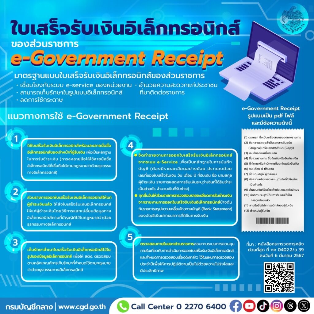 นางแพตริเซีย มงคลวนิช อธิบดีกรมบัญชีกลาง เปิดเผยว่า ปัจจุบันส่วนราชการใช้ใบเสร็จรับเงินตามแบบที่กระทรวงการคลังกำหนด ไม่ครอบคลุมถึงกรณีการออกใบเสร็จรับเงินอิเล็กทรอนิกส์ ดังนั้น กรมบัญชีกลางจึงได้กำหนดแบบใบเสร็จรับเงินอิเล็กทรอนิกส์ของส่วนราชการ หรือ e-Government Receipt เพิ่มเติมขึ้น เพื่อให้ส่วนราชการที่มีการจัดเก็บหรือรับชำระเงินผ่านระบบบริการแบบอิเล็กทรอนิกส์ (e-Service) สามารถออกใบเสร็จรับเงินอิเล็กทรอนิกส์ที่สอดคล้องกับมาตรฐานสากล เป็นไปตามที่สำนักงานพัฒนาธุรกรรมทางอิเล็กทรอนิกส์ (สพธอ.) กำหนด