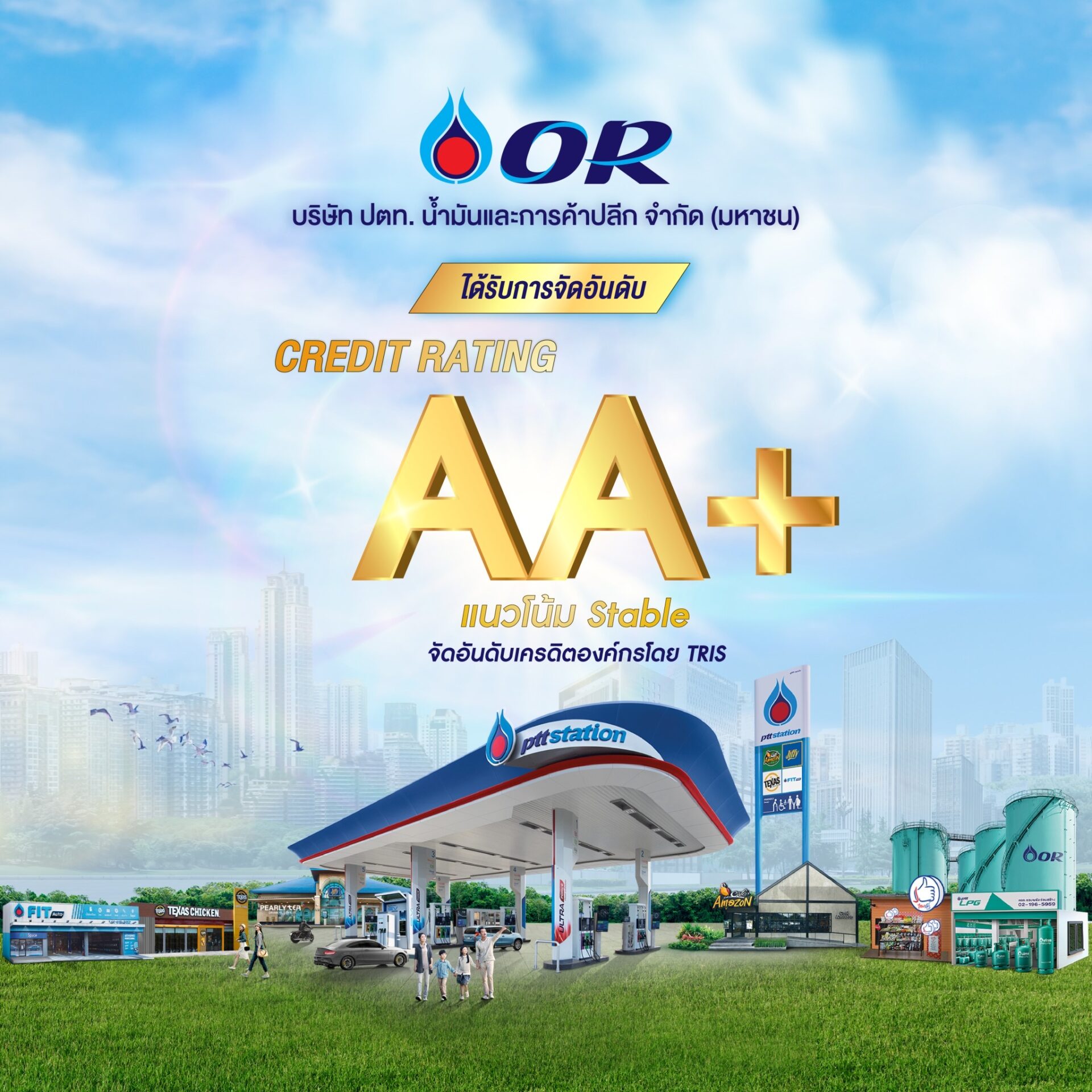 การจัดอันดับเครดิตของ TRIS สะท้อนถึงความเชื่อมั่นต่อการดำเนินธุรกิจ กระแสเงินสดและสภาพคล่องที่แข็งแกร่งของ โออาร์ในสถานการณ์ของเศรษฐกิจโลก ความผันผวนของราคาน้ำมัน และการเปลี่ยนผ่านของพลังงานน้ำมันไปสู่พลังงานไฟฟ้า ทั้งนี้ โออาร์ยังคงพร้อมเดินหน้าสร้างการเติบโตทางธุรกิจอย่างต่อเนื่อง ด้วยการแสวงหาโอกาสการลงทุนในธุรกิจที่เกี่ยวเนื่องร่วมกับพันธมิตรที่มีศักยภาพทั้งในและต่างประเทศ รวมทั้งมีการบริหารจัดการสถานะทางการเงินให้มีความเข้มแข็งและพร้อมรับมือกับความท้าทายต่าง ๆ เพื่อสร้างมูลค่าเพิ่มให้แก่ผู้ถือหุ้นและผู้มีส่วนได้เสียอย่างยั่งยืน ตลอดจนให้ความสำคัญกับการดำเนินธุรกิจที่สอดคล้องกับแนวทาง SDG ในแบบฉบับของโออาร์ทั้งในด้าน “S” หรือ “Small” ที่มุ่งเน้นการให้โอกาสเพื่อคนตัวเล็ก ด้าน “D” หรือ “DIVERSIFIED” ที่เน้นการสร้างโอกาสเพื่อการเติบโตในทุกรูปแบบผ่านแฟลตฟอร์มต่าง ๆ ของโออาร์และด้าน “G” หรือ “GREEN” ที่มุ่งสร้างสิ่งแวดล้อมที่อุดมสมบูรณ์ (Healthy Environment) เพื่อตอบโจทย์เป้าหมาย OR 2030 อย่างมีประสิทธิภาพ.-517-สำนักข่าวไทย