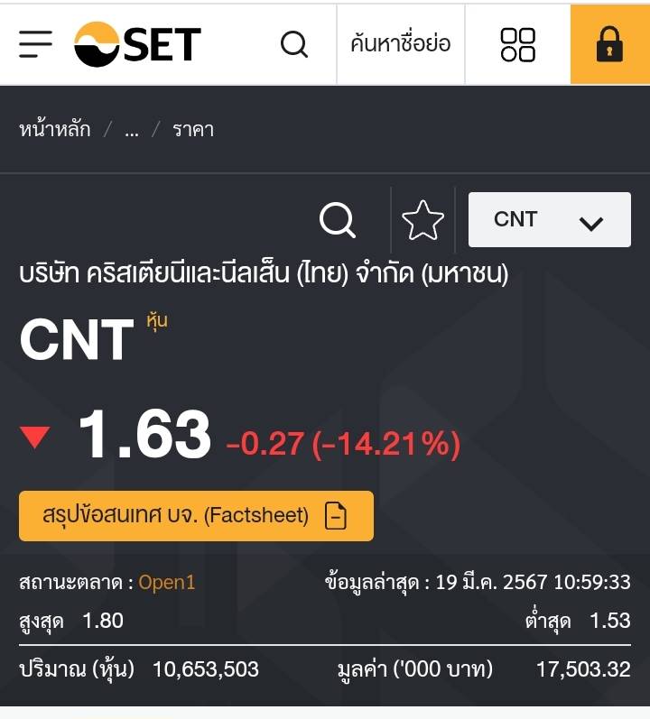 ด้านราคา หุ้น CNT เช้านี้ ร่วง โดย ลดลง 14.21% เมื่อเวลา 10.59 น. มาอยู่ที่ 1.63 บาท .-511 สำนักข่าวไทย