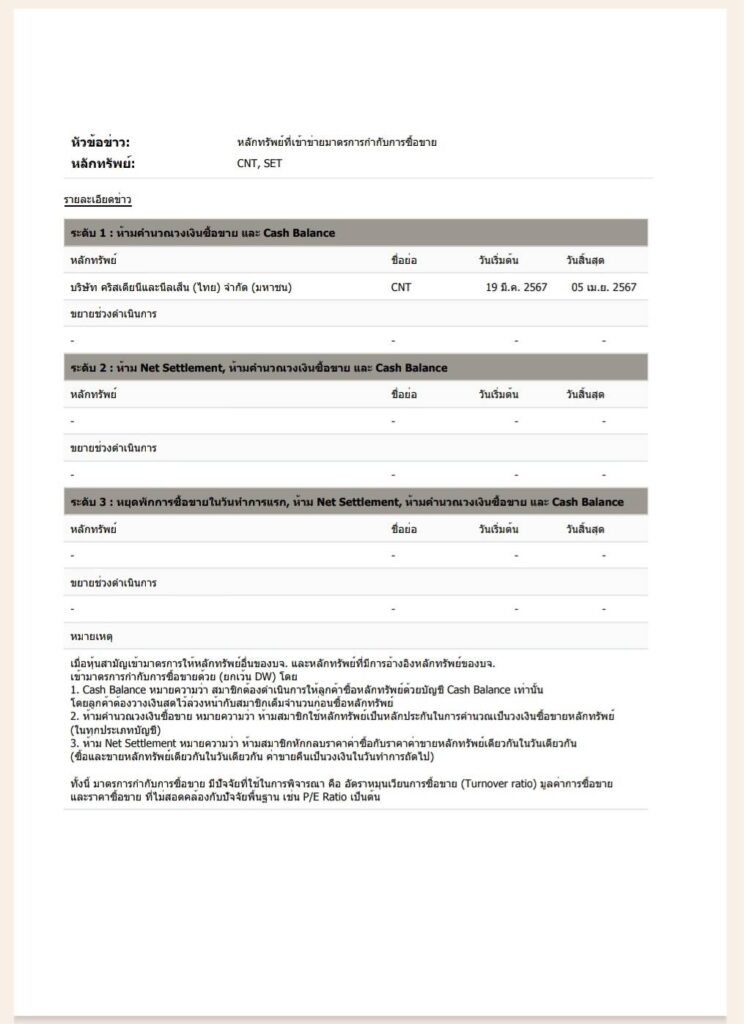 ตลาดหลักทรัพย์แห่งประเทศไทย (ตลท.) ประกาศให้ CNT เข้ามาตรการกำกับการซื้อขาย ระดับ 1 : ห้ามคำนวณวงเงินซื้อขาย และ Cash Balance วันที่ 19 มี.ค.67 ถึง 05 เม.ย.67 หลังจากราคาหุ้น CNT ปรับขึ้นมาร้อนแรงต่อเนื่องจากราคาปิด 1.06 บาทเมื่อวันที่ 11 มี.ค.มาปิดวันนี้ 1.90 บาท หรือดีดขึ้นมา 79.24%