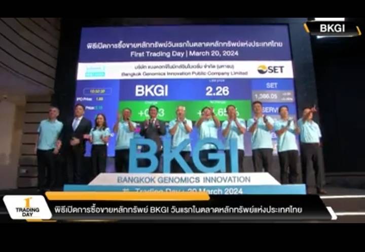 บมจ. แบงคอกจีโนมิกส์อินโนเวชั่น (BKGI) เข้าจดทะเบียนและเริ่มซื้อขายในตลาดหลักทรัพย์ฯ ในกลุ่มอุตสาหกรรมบริการ หมวดธุรกิจการแพทย์ ในวันนี้ ด้วยมูลค่าหลักทรัพย์ ณ ราคา IPO 978 ล้านบาท โดยใช้ชื่อย่อในการซื้อขายหลักทรัพย์ ว่า BKGI เปิดเทรดที่ 2.18 บาท เพิ่มขึ้น 0.55 บาท หรือ 33.74% จากราคา IPO ที่ 1.63 บาท