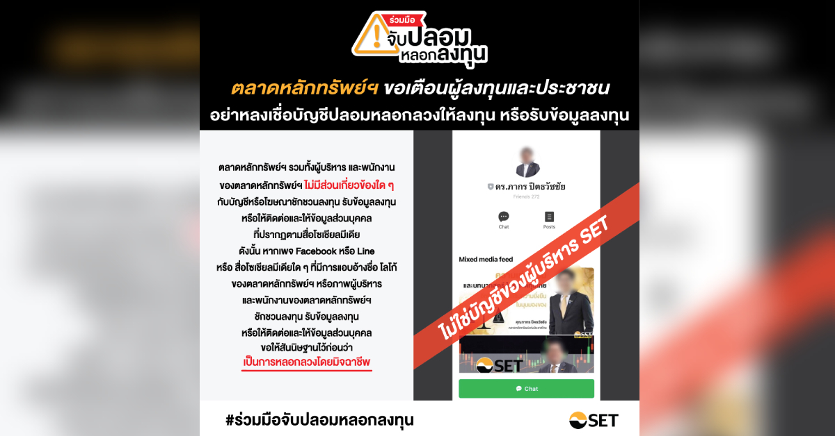 ตามที่ปรากฏบัญชีโซเชียลมีเดียปลอมที่แอบอ้างชื่อและภาพของผู้บริหารตลาดหลักทรัพย์แห่งประเทศไทย (“ตลาดหลักทรัพย์ฯ”) รวมทั้งได้มีการใช้บัญชีดังกล่าวไปชักชวนหรือหลอกลวงประชาชนทั่วไปให้มาร่วมลงทุน หรือรับข้อมูลการลงทุน นั้น