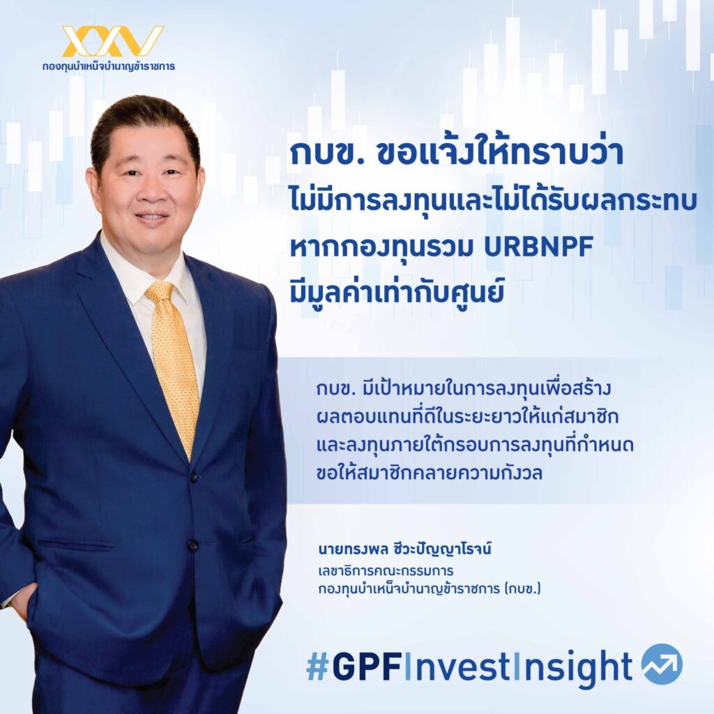 นายทรงพล ชีวะปัญญาโรจน์ เลขาธิการคณะกรรมการกองทุนบำเหน็จบำนาญข้าราชการ (กบข.) เปิดเผยว่าตามที่ตลาดหลักทรัพย์ฯ เตือนผู้ลงทุนให้ใช้ความระมัดระวังก่อนตัดสินใจลงทุนในการซื้อขายหลักทรัพย์ กองทุนรวมสิทธิการเช่าอสังหาริมทรัพย์เออร์บานา (URBNPF) เนื่องจากกองทุนอาจมีเหตุถูกบอกเลิกสัญญาสิทธิการเช่าและเลิกกองทุนรวมนั้น กบข.ขอแจ้งให้ทราบว่า กบข.ไม่มีการลงทุนในกองทุนรวม URBNPF และไม่ได้รับผลกระทบหากกองทุนรวมดังกล่าวมีมูลค่าเท่ากับศูนย์