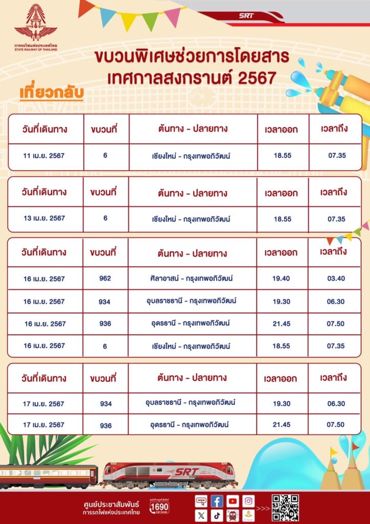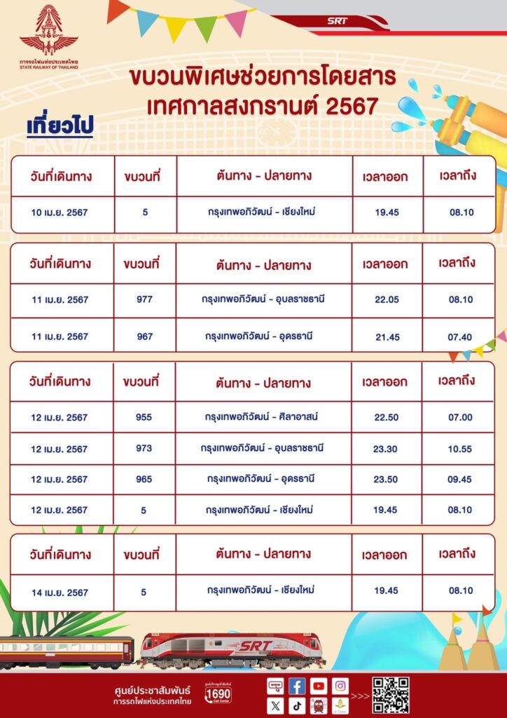 นายนิรุฒ มณีพันธ์ ผู้ว่าการรถไฟแห่งประเทศไทย ได้สั่งการให้ฝ่ายเกี่ยวข้องจัดเตรียมมาตรการอำนวยความสะดวกรองรับการเดินทางในเทศกาลสงกรานต์ ซึ่งปีนี้คาดว่าจะมีประชาชนนักท่องเที่ยวใช้บริการรถไฟเดินทางมากกว่าทุกครั้ง โดยได้เพิ่มขบวนรถเสริมพิเศษช่วงเทศกาลสงกรานต์อีก 16 ขบวน ในเส้นทางสายเหนือและสายตะวันออกเฉียงเหนือ เที่ยวไปตั้งแต่วันที่ 10–14 เมษายน 2567 และเที่ยวกลับตั้งแต่วันที่ 11-17 เมษายน 2567 พร้อมกับจัดพ่วงตู้โดยสารในขบวนรถธรรมดา และขบวนรถชานเมืองให้เต็มหน่วยลากจูงในทุกเส้นทาง รองรับการเดินทางของผู้โดยสารได้ไม่ต่ำกว่า 100,000 คน/วัน เริ่มเปิดจองตั๋วโดยสารขบวนรถเสริมพิเศษทั้ง 16 ขบวน ผ่านระบบ D-Ticket หรือสถานีรถไฟทุกแห่งทั่วประเทศ ตั้งแต่วันที่ 22 มีนาคม 2567 เวลา 08.30 น. เป็นต้นไปพร้อมกันนี้ การรถไฟฯ ยังขอแจ้งงดให้บริการขบวนรถนำเที่ยวจำนวน 4 ขบวน ได้แก่ ขบวนที่ 909/910 (กรุงเทพ-น้ำตก-กรุงเทพ) และขบวนที่ 911/912 (กรุงเทพ-สวนสนประดิพัทธ์-กรุงเทพ) ระหว่างวันที่ 13-16 เมษายน 2567 ซึ่งเป็นวันหยุดเสาร์-อาทิตย์ และวันหยุดนักขัตฤกษ์ เพื่อนำรถพ่วง มาหมุนเวียนใช้งาน กับขบวนรถพิเศษในช่วงเทศกาลสงกรานต์ได้อย่างเพียงพอ