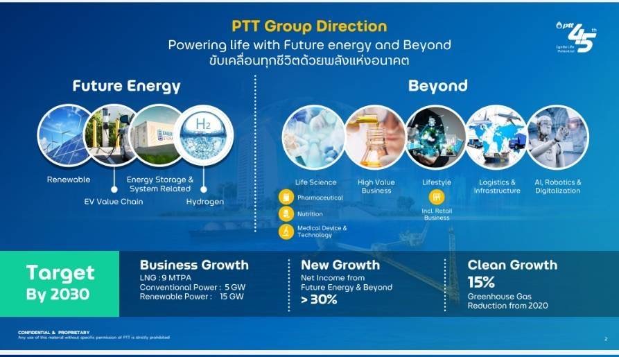 2. New Growth ธุรกิจพลังงานใหม่และธุรกิจอื่นๆ นอกเหนือจากพลังงานต้องสร้างกำไรในปี 2573 มากกว่าร้อยละ 30 พร้อมลงทุนและเพิ่มสัดส่วนกำไรจากธุรกิจที่เป็น Future Energy และที่ไกลกว่าพลังงานกลุ่ม Beyond