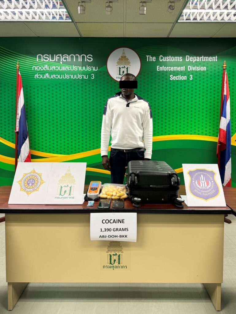นายพันธ์ทอง ลอยกุลนันท์ ที่ปรึกษาด้านการพัฒนาและบริหารการจัดเก็บภาษี ในฐานะโฆษกกรมศุลกากร เปิดเผยว่า กรมศุลกากร สนธิกำลังกับหน่วยสกัดกั้นยาเสพติดทางท่าอากาศยานนานาชาติ (AITF) ตรวจพบชาวไนจีเรีย เดินทางมาจากเมืองโดฮา (DOHA) รัฐกาตาร์ (QATAR) ปลายทางท่าอากาศยานสุวรรณภูมิ ประเทศไทย ผู้ต้องสงสัยแสดงอาการพิรุธ จึงส่งตัวเข้าตรวจสอบ พบยาเสพติดให้โทษประเภท 2 (โคคาอีน) ซุกซ่อนอยู่ภายในร่างกายโดยวิธีการกลืน น้ำหนักรวมสิ่งห่อหุ้ม 1,390 กรัม มูลค่า 4.17 ล้านบาท เจ้าหน้าที่ชุดจับกุม จึงทำบันทึกจับกุมและนำตัวส่งพนักงานสอบสวนสถานีตำรวจภูธรท่าอากาศยานสุวรรณภูมิเพื่อดำเนินคดี