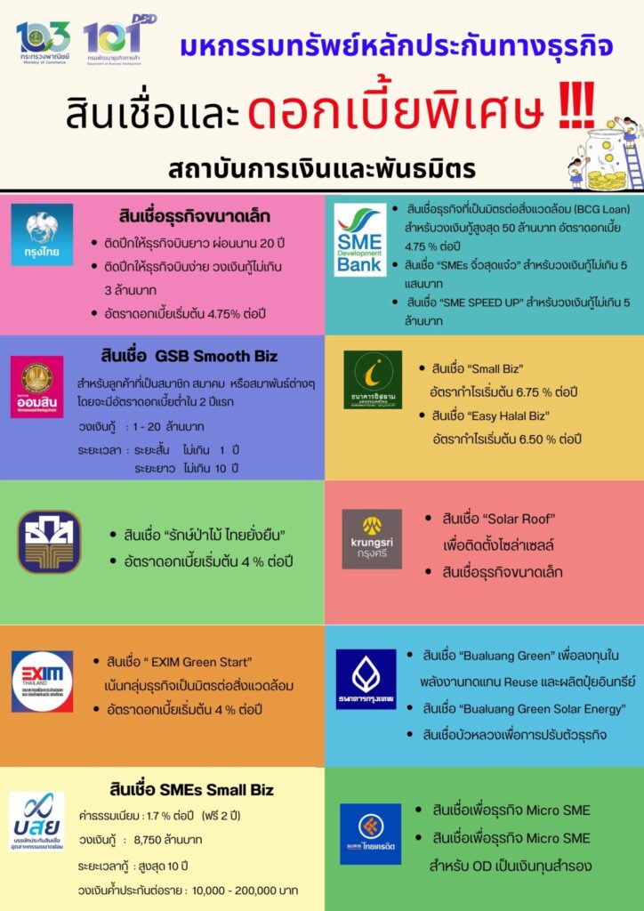 นายนภินทร ศรีสรรพางค์ รัฐมนตรีช่วยว่าการกระทรวงพาณิชย์กล่าวว่า กรมพัฒนาธุรกิจการค้าจัด “มหกรรมทรัพย์หลักประกันทางธุรกิจ”ให้ความรู้เกี่ยวกับทรัพย์หลักประกัน พร้อมดึงสถาบันการเงินมาให้คำแนะนำแบบครบวงจร ซึ่งไฮไลท์ภายในงาน มีสถาบันการเงิน มาให้คำแนะนำและให้สินเชื่อเพื่อธุรกิจอัตราดอกเบี้ยพิเศษ ได้แก่ ธนาคารกรุงไทย ธนาคารกรุงเทพ ธนาคารกรุงศรีอยุธยา ธนาคารไทยเครดิต บรรษัทประกันสินเชื่ออุตสาหกรรมขนาดย่อม (บสย.) ธนาคารเพื่อการเกษตรและสหกรณ์การเกษตร (ธ.ก.ส.) ธนาคารพัฒนาวิสาหกิจขนาดกลางและขนาดย่อมแห่งประเทศไทย (SME D Bank) ธนาคารออมสิน ธนาคารอิสลามแห่งประเทศไทย และธนาคารเพื่อการส่งออกและนำเข้าแห่งประเทศไทย (EXIM Bank) รวมทั้งสมาคมนักประเมินราคาอิสระไทย มาร่วมให้บริการประเมินราคาทรัพย์สินที่ใช้เป็นหลักทรัพย์ค้ำประกันการขอสินเชื่อ