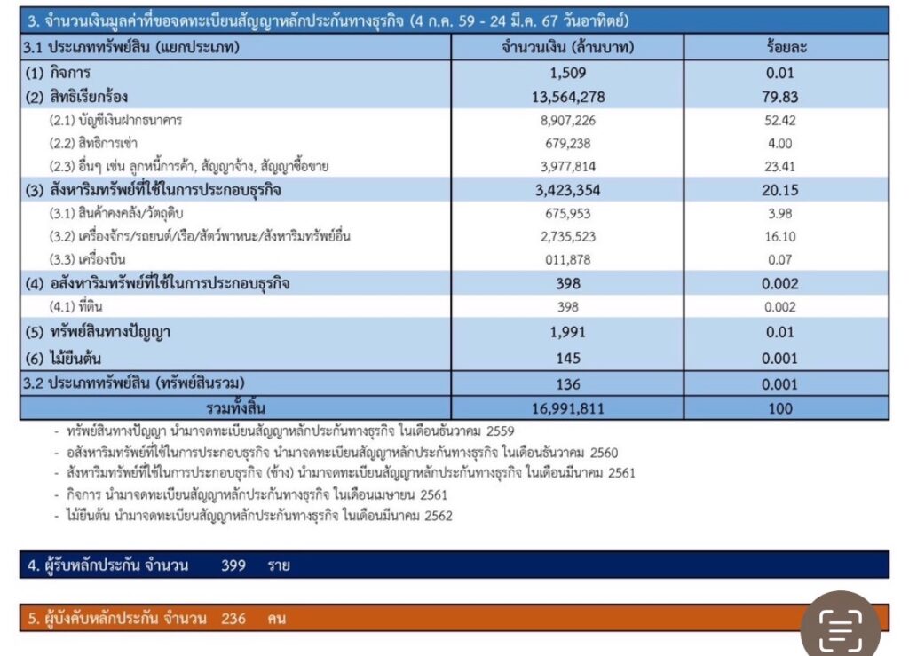 ส่วนกฎหมายหลักประกันทางธุรกิจ พ.ศ. 2558 ที่ใช้มาแล้ว 9 ปี มีผู้ประกอบการ ยื่นจดทะเบียนสัญญาหลักประกันทางธุรกิจ แล้วกว่า 820,000 ราย รวมสินเชื่อที่ปล่อยกู้กว่า 18.6 ล้านล้านบาท ถือเป็นเม็ดเงินที่สูงมาก โดยทรัพย์สินที่นำมาเป็นหลักประกันได้ มี 6 ประเภท ได้แก่ (1) กิจการ (2) สิทธิเรียกร้อง เช่น สิทธิการเช่า ลูกหนี้การค้า (3) สังหาริมทรัพย์ที่ใช้ในการประกอบธุรกิจ เช่น สินค้าคงคลัง วัตถุดิบ (4) อสังหาริมทรัพย์ เฉพาะกรณีที่ผู้ให้หลักประกันประกอบธุรกิจอสังหาริมทรัพย์โดยตรง (5) ทรัพย์สินทางปัญญา เช่น ลิขสิทธิ์ เครื่องหมายการค้า และ (6) ทรัพย์สินอื่นตามที่กำหนดในกฎกระทรวง ก็คือ ไม้ยืนต้นอีกด้วย.-514-สำนักข่าวไทย