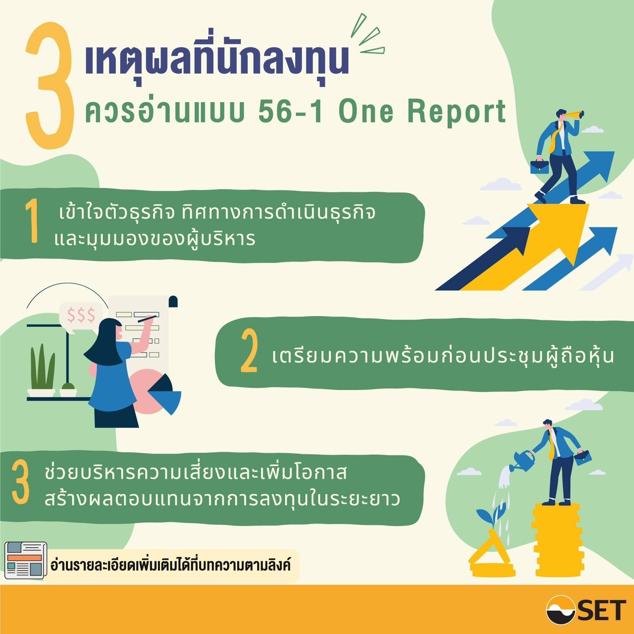 ตลาดหลักทรัพย์แห่งประเทศไทย (ตลท.) เผยแพร่บทความ “3 เหตุผลที่นักลงทุนควรอ่านแบบ 56-1 One Report” โดย กัญญารัตน์ ทวีศิริธนากุล ฝ่ายพัฒนาการลงทุนอย่างยั่งยืน โดย แบบ 56-1 One Report คือ รายงานประจำปีที่สำนักงานคณะกรรมการกำกับหลักทรัพย์และตลาดหลักทรัพย์ (ก.ล.ต.) กำหนดให้บริษัทจดทะเบียนต้องนำส่งต่อ ก.ล.ต. ภายใน 3 เดือนนับตั้งแต่วันสิ้นสุดรอบระยะเวลาบัญชี โดยประกอบด้วยข้อมูลสำคัญที่จะช่วยให้นักลงทุนเข้าใจภาพรวมและทิศทางการดำเนินธุรกิจมากขึ้น โดยเฉพาะเรื่องลักษณะการดำเนินธุรกิจ การวิเคราะห์ความเสี่ยงและโอกาส ผลการดำเนินงานและฐานะทางการเงิน ซึ่งครอบคลุมถึงข้อมูลการดำเนินงานด้านความยั่งยืน (Environmental, Social and Governance หรือ ESG) ของบริษัท สะท้อนถึงการทำธุรกิจบนพื้นฐานของการกำกับดูแลกิจการที่ดี คำนึงถึงผู้มีส่วนได้เสียต่าง ๆ เพื่อความสามารถในการเติบโตในระยะยาว ซึ่งนักลงทุนควรอ่านแบบ 56-1 One Report ด้วยเหตุผล 3 ประการ ได้แก่