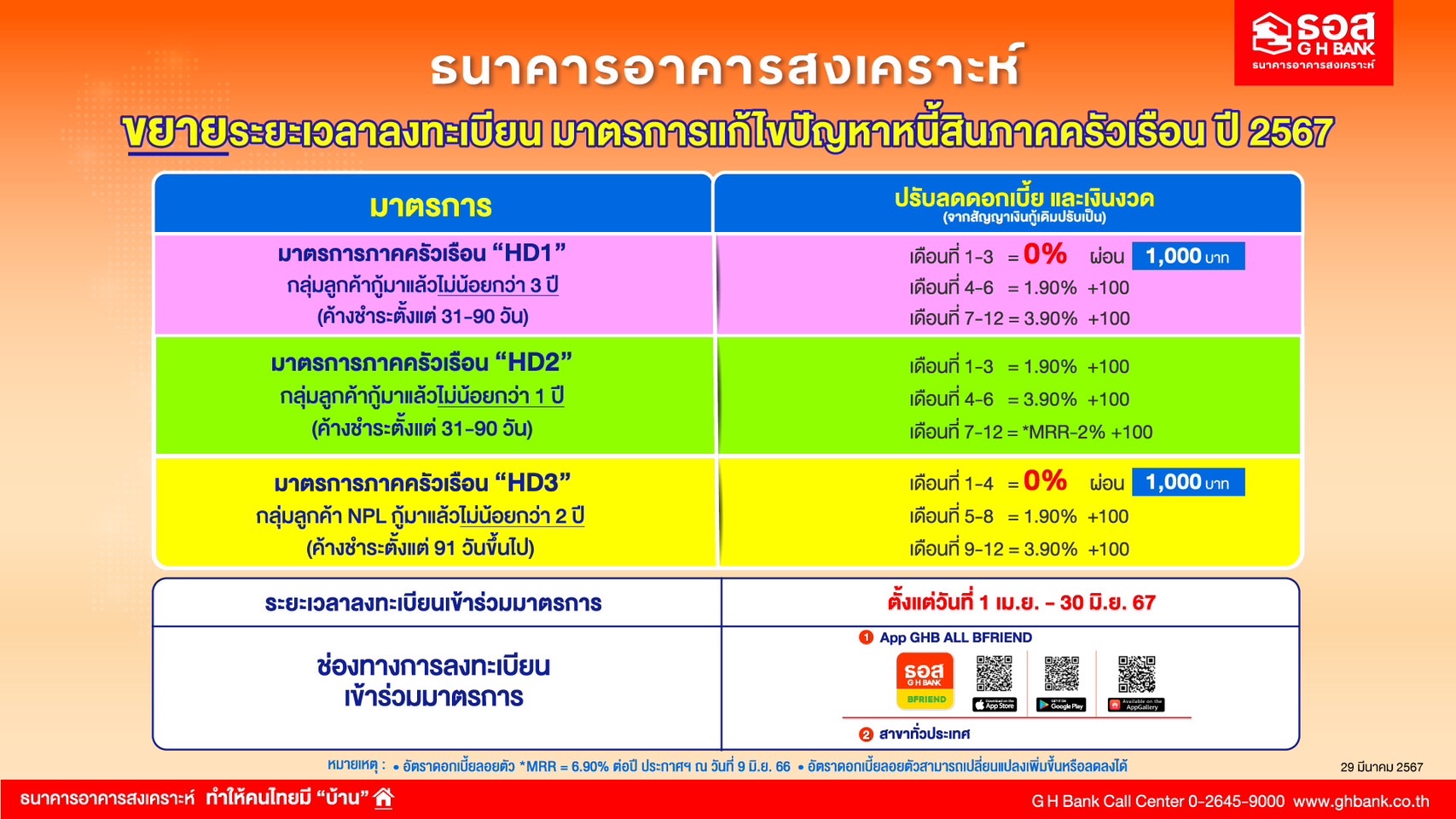 สำหรับลูกค้าที่ประสงค์เข้าร่วมมาตรการข้างต้น สามารถลงทะเบียนเข้าร่วมมาตรการได้ตั้งแต่วันนี้ถึงวันที่ 30 มิถุนายน 2567 ผ่านทาง Application : GHB ALL BFRIEND โดยลูกค้าจะต้อง Upload หลักฐานยืนยัน