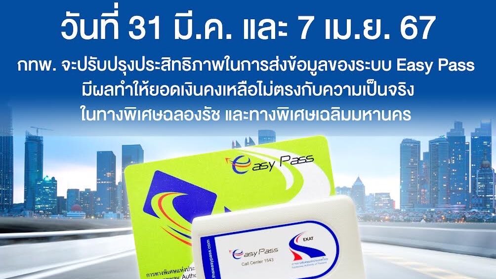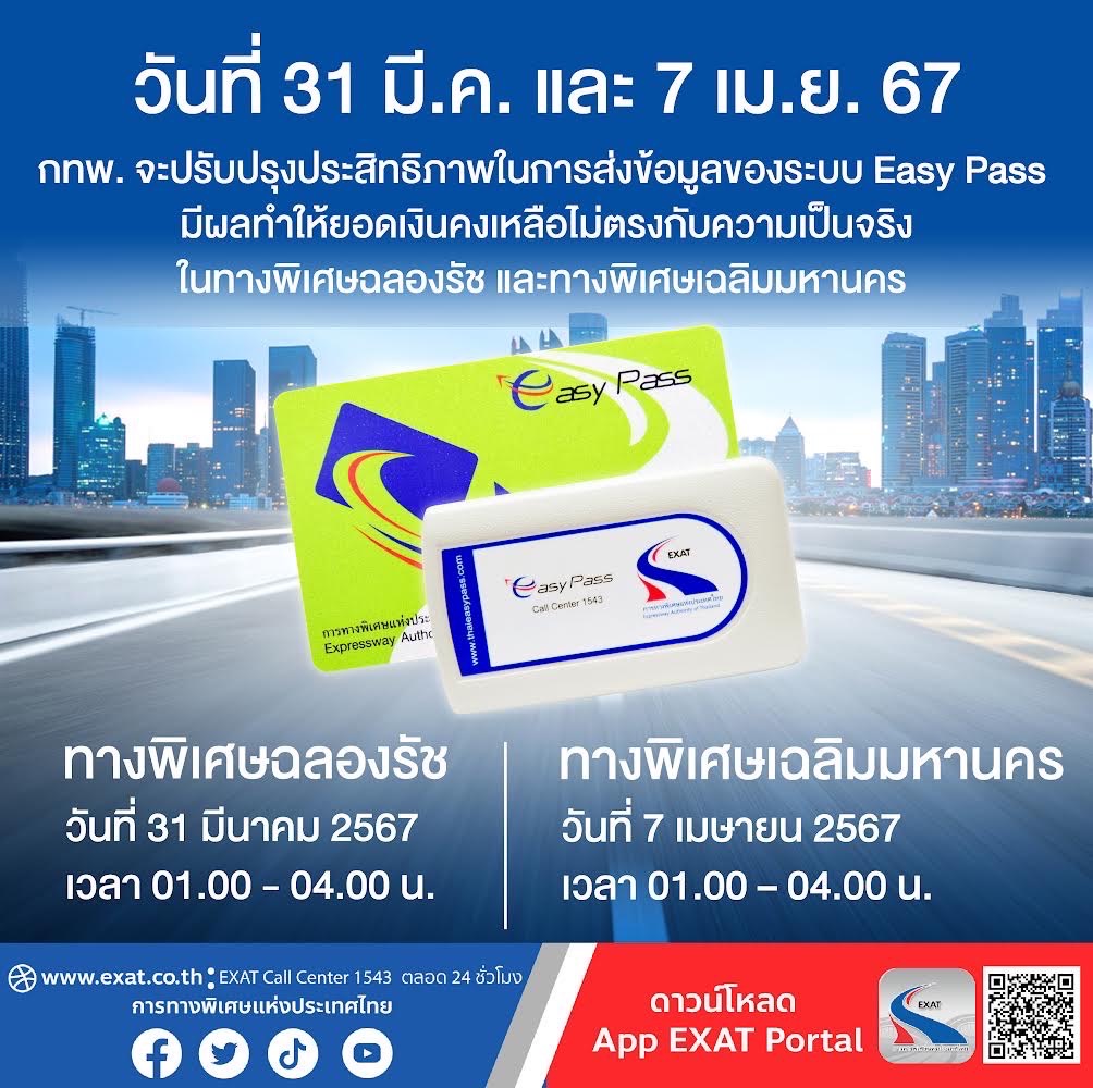 การทางพิเศษแห่งประเทศไทย (กทพ.) กระทรวงคมนาคม จะทำการปรับปรุงประสิทธิ์ภาพในการส่งข้อมูลของระบบ Easy Pass มีผลทำให้ยอดเงินคงเหลือไม่ตรงกับความเป็นจริง ในระบบเก็บค่าผ่านทางอัตโนมัติ บนทางพิเศษฉลองรัช ในวันที่ 31 มีนาคม 2567 ช่วงเวลา 01.00 – 04.00 น. และทางพิเศษเฉลิมมหานคร ในวันที่ 7 เมษายน 2567 ช่วงเวลา 01.00 – 04.00 น.