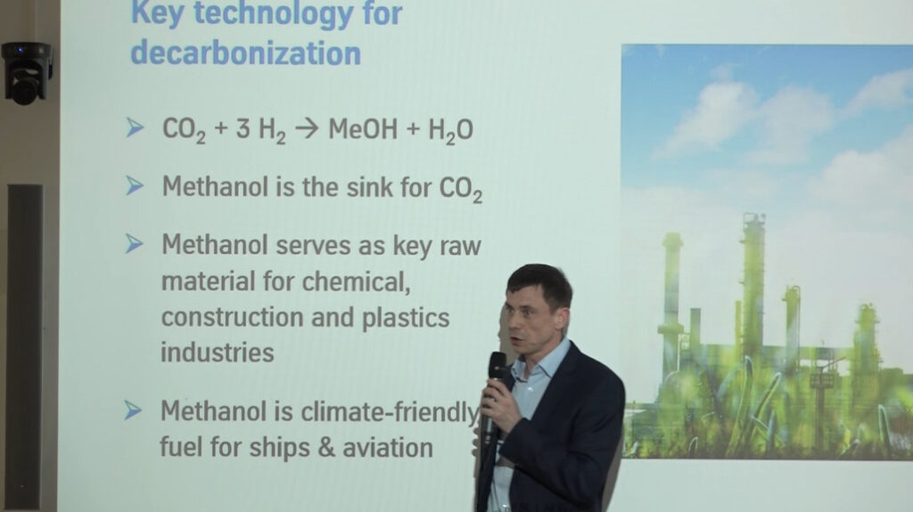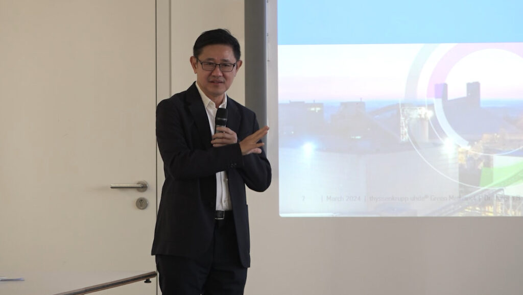 ดร.เยอร์เก้น บัตเค่อ ผู้จัดการอาวุโสฝ่ายขายกล่าวว่า ธิสเซ่นครุปป์ อูเด้ห์จัดทำโครงการ Carbon2Chem เพื่อพัฒนาเทคโนโลยีการนำก๊าซคาร์บอนไดออกไซด์จากกระบวนการถลุงเหล็ก มาใช้ร่วมกับกรีนไฮโดรเจนที่ได้จากการแยกน้ำด้วยพลังงานไฟฟ้าหรือ Water Electrolysis แล้วใช้กระบวนการทางเคมีเพื่อสังเคราะห์เป็นกรีนเมทานอล นับเป็นเทคโนโลยีต้นกำเนิดของธิสเซ่นครุปป์ อูเด้ห์