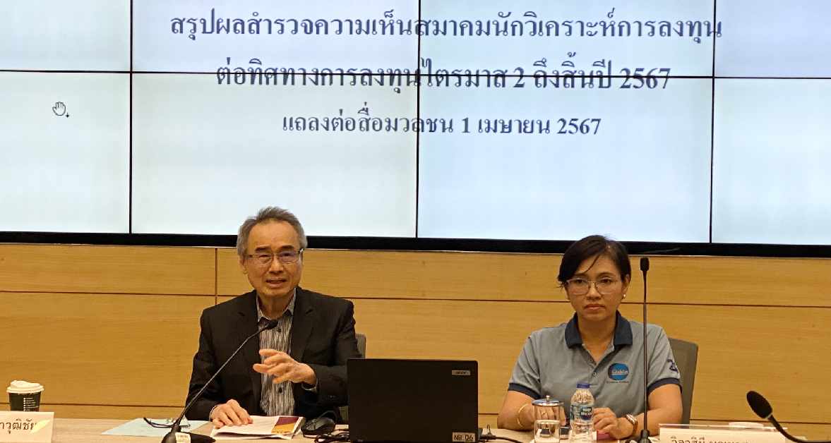 นายสมบัติ นราวุฒิชัย เลขาธิการและกรรมการผู้อำนวยการ สมาคมนักวิเคราะห์การลงทุนกล่าวถึงผลสำรวจความเห็นนักวิเคราะห์แนวโน้มการลงทุน ไตรมาส 2 ปี 2567 ว่า จากผลการสำรวจความเห็นสมาชิกนักวิเคราะห์และผู้จัดการกองทุนรวม 24 สำนัก เกี่ยวกับมุมมองการลงทุนในไตรมาส 2-4 ของปี 2567 สรุปได้ดังนี้ คือ โดยสมมติฐานหลัก ราคาน้ำมันดิบเฉลี่ยของปีนี้ 82.36 เหรียญสหรัฐต่อบาร์เรล คาดการณ์ การขยายตัวของ GDP ไทยปี 2567 จากเดิมที่ 3.33% (ม.ค.67) ลดลงมาเหลือ 2.80% Risk Free Rate ที่ใช้ในการประเมินมูลค่า มีค่าเฉลี่ยอยู่ที่ 2.71% และRisk Premium ของตลาดหุ้น เฉลี่ยอยู่ที่ 8.13%