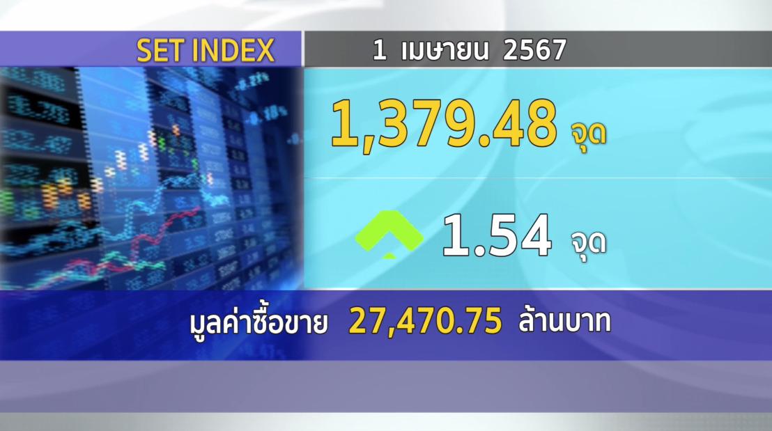 กทม. 1 เม.ย.- SET ปิดวันนี้ที่ 1,379.48 จุด เพิ่มขึ้น 1.54 จุด (+0.11%) มูลค่าซื้อขาย 27,470.75 ล้านบาท