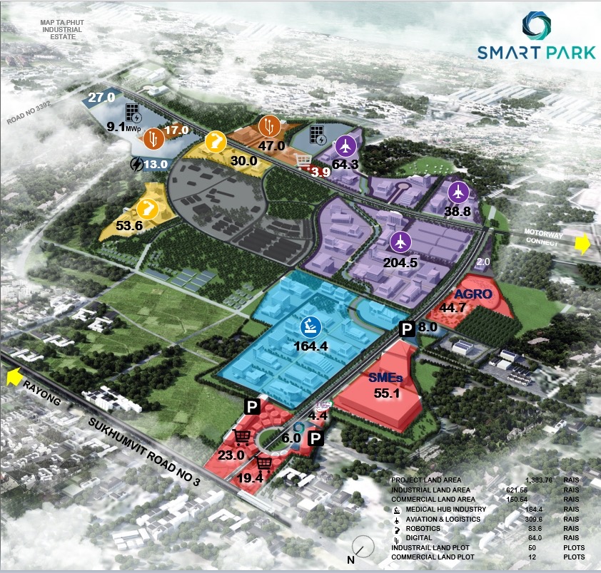 โครงการนิคมอุตสาหกรรมสมาร์ท ปาร์ค (Smart Park) ในพื้นที่มาบตาพุด จังหวัดระยอง มีพื้นที่โครงการ 1,383.71 ไร่ ถือเป็นนิคมอุตสาหกรรมแห่งใหม่ที่ก้าวข้ามการพัฒนานิคมอุตสาหกรรมในพื้นฐานเดิม โดยมี กลุ่มอุตสาหกรรมเป้าหมายที่ใช้เทคโนโลยีที่ทันสมัยและเป็นมิตรต่อสิ่งแวดล้อม ได้แก่ กลุ่มอุตสาหกรรมการบินและโลจิสติกส์ (Aviation & Logistics) กลุ่มอุตสาหกรรมการแพทย์ (Medical Device) กลุ่มอุตสาหกรรมหุ่นยนต์ (Robotics) และกลุ่มอุตสาหกรรมดิจิทัล (Digital) เพื่อเสริมสร้างความเป็นเมืองอุตสาหกรรมเชิงนิเวศที่ทันสมัย ปลอดภัย ควบคู่กับการดูแลสิ่งแวดล้อมและชุมชนโดยรอบ ภายใต้แนวคิดนิคมอุตสาหกรรมที่มุ่งสู่ความเป็นกลางทางคาร์บอน ตามนโยบายของรัฐบาลที่กำหนดให้ต้องบรรลุเป้าหมายความเป็นกลางทางคาร์บอน ภายในปี 2593