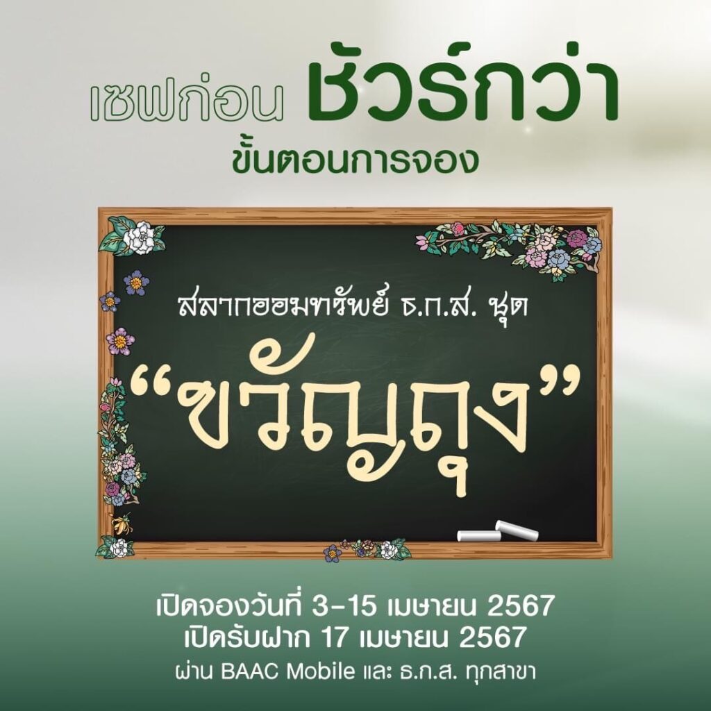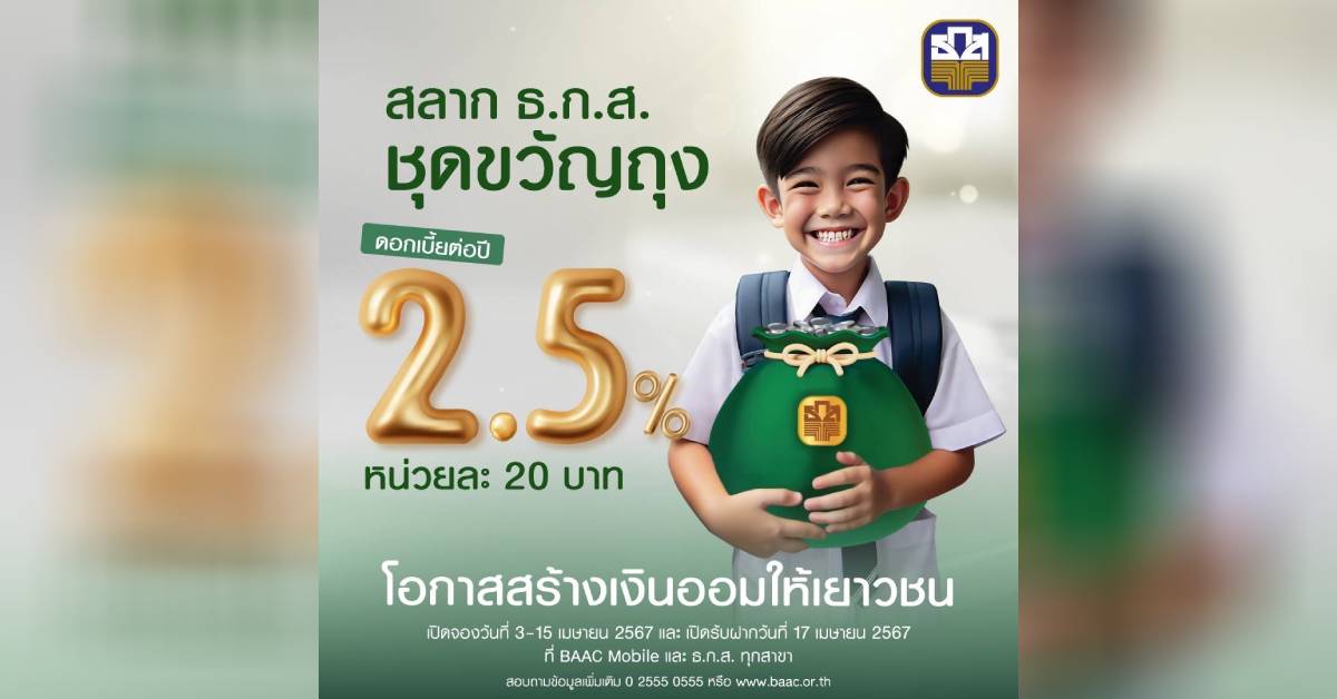 ธ.ก.ส. เปิดตัว “สลากออมทรัพย์ ธ.ก.ส. ชุดขวัญถุง” หนุนสร้างวินัยการออมเงินระยะยาวให้เด็กนักเรียนเพียงหน่วยละ 20 บาท จำนวน 100 ล้านหน่วย วงเงินรวม 2,000 ล้านบาท อายุรับฝาก 6 ปี เมื่อฝากครบกำหนดรับดอกเบี้ยทันที 2.50% ต่อปี พร้อมลุ้นรับทุนการศึกษาทุกงวด มูลค่า 10,000 บาท จำนวน 100 รางวัล และรางวัลพิเศษ ปีละ 2 ครั้ง ในเดือนมกราคมและเดือนกันยายน มูลค่ารางวัลละ 100,000 บาท จำนวน 12 รางวัล รวมมูลค่ารางวัล 73.2 ล้านบาท เปิดจองวันที่ 3 – 15 เมษายนนี้ ผ่านเคาน์เตอร์ ธ.ก.ส. ทุกสาขา ทั่วประเทศและแอปพลิเคชัน BAAC Mobile