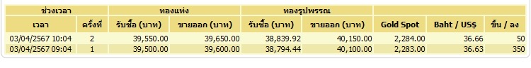 สมาคมค้าทองคำ แจ้งว่า เมื่อเวลา 10.04 นาที ราคาทองไทยขึ้น 2 รอบ รวม 400 บาท ราคาทองรูปพรรณขายออกบาทละ 40,150 บาท รับซื้อ 38,839.92 บาท ส่วนทองแท่ง ขายออก 39,650 บาท รับซื้อ 39,550 บาท