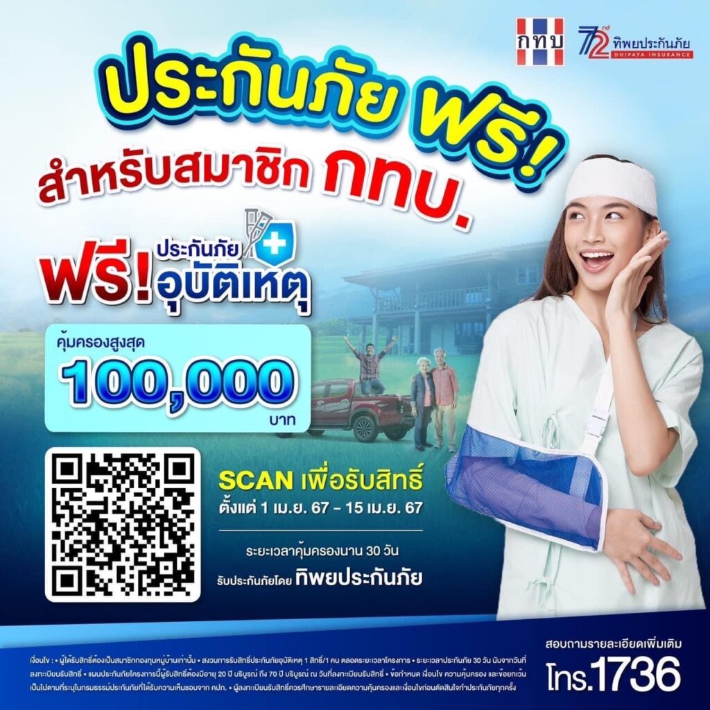 นายสมศักดิ์ เทพสุทิน รองนายกรัฐมนตรี เปิดเผยว่า เพื่อเป็นการลดความเสี่ยงให้กับพี่น้องประชาชน กองทุนหมู่บ้านฯ ได้ร่วมมือกับ ทิพยประกันภัย ทำประกันภัยอุบัติเหตุฟรี ให้แก่สมาชิกกองทุนหมู่บ้านฯ ช่วงสงกรานต์ ที่มีอายุ 20-70 ปี โดยคุ้มครองสูงสุด 100,000 บาท ระยะเวลาคุ้มครองนาน 30 วัน โดยสมาชิกกองทุนหมู่บ้านฯ ที่สนใจ สามารถลงทะเบียนรับสิทธิได้ที่คิวอาร์โค๊ด ตั้งแต่วันที่ 1 เมษายน – 15 เมษายน นี้ ระยะเวลาคุ้มครอง 30 วัน จะเริ่มนับจากวันที่ลงทะเบียนรับสิทธิ