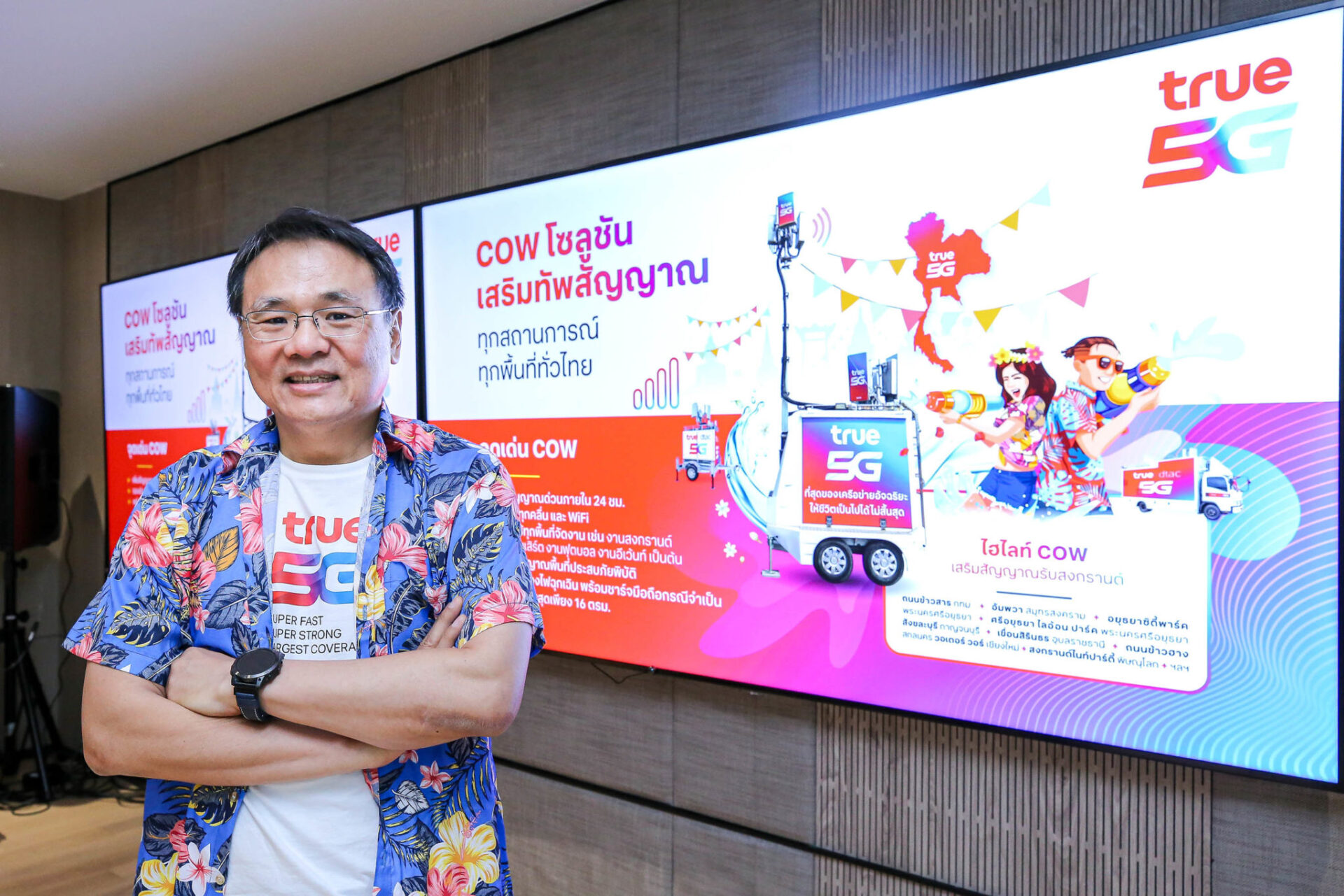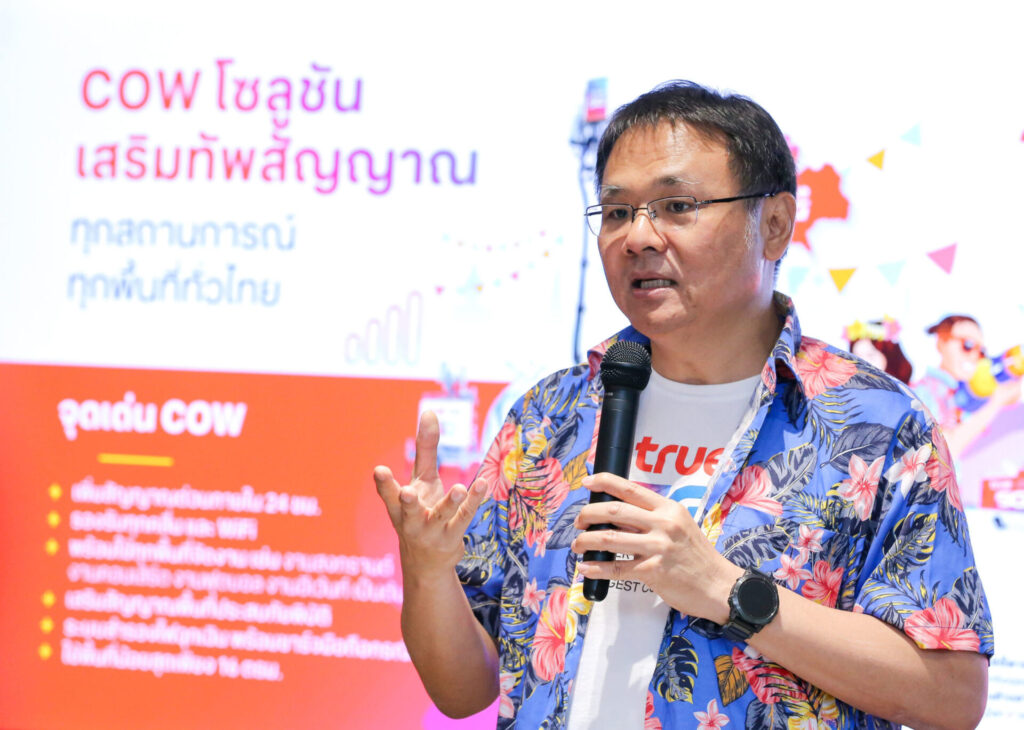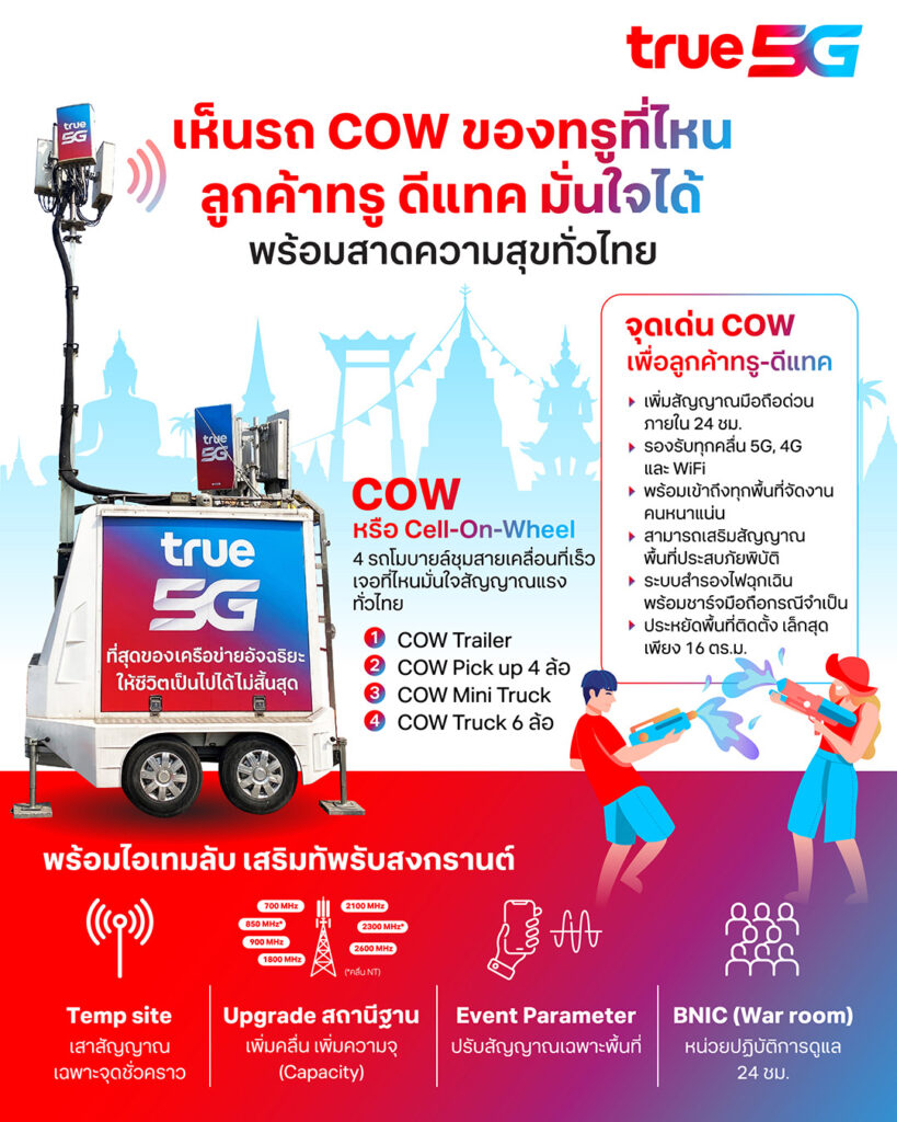 ทรู คอร์ปอเรชั่น เอาใจสายเที่ยวทั่วไทยรับเทศกาลสงกรานต์ ชู “COW” เห็นที่ไหนมั่นใจได้เลย พร้อมทัพโซลูชันเสริมสัญญาณมือถือ 5G 4G และ WiFi สุขยิ่งขึ้น เร็วแรงยิ่งขึ้น ครอบคลุมยิ่งขึ้น รองรับการใช้งานลูกค้าแบรนด์ทรูและดีแทคทั่วไทยช่วงฉลองเทศกาลสงกรานต์ 2567 และวันหยุดยาวเพื่อเดินทางท่องเที่ยว ไหว้พระทำบุญรับความสุขปีใหม่ไทย พร้อมทั้งลูกหลานที่ทำงานต่างท้องถิ่นได้เดินทางกลับภูมิลำเนาพบญาติผู้ใหญ่และอยู่พร้อมหน้าพร้อมตาในครอบครัว รวมถึงสืบสานประเพณีรดน้ำดำหัวผู้ใหญ่เพื่อเป็นสิริมงคล