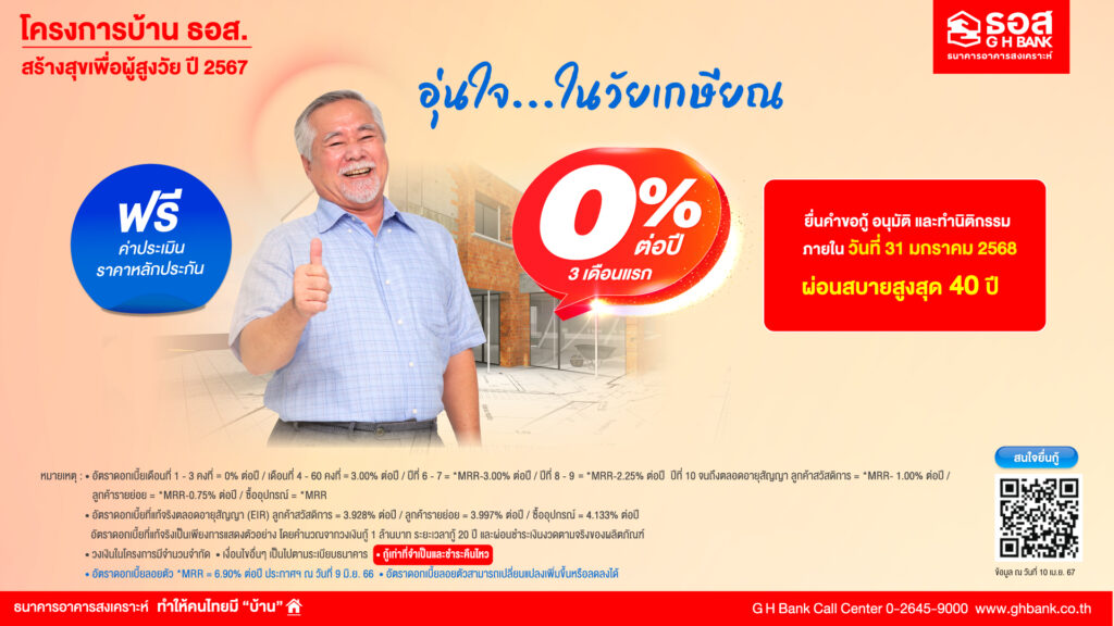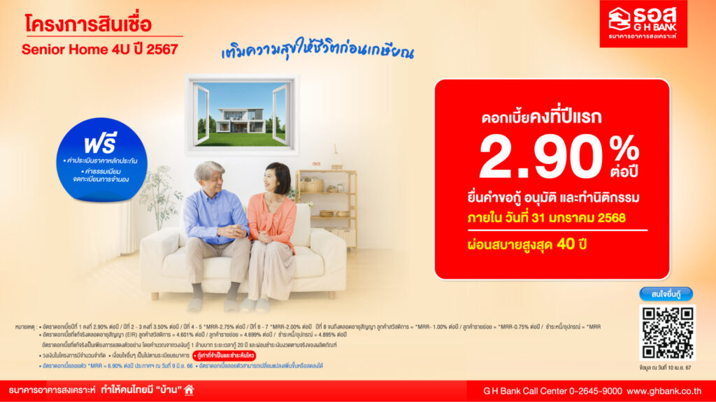 3.โครงการสินเชื่อ Senior Home 2U ปี 2567 กรอบวงเงิน 1,000 ล้านบาท สำหรับผู้ที่ต้องการซื้อที่อยู่อาศัยจากผู้ที่มีอายุ 50 ปีขึ้นไป เป็นสัญญาแรก โดยไม่มีประวัติการผ่อนชำระสินเชื่อที่อยู่อาศัยกับ ธอส.และสถาบันการเงินอื่น อัตราดอกเบี้ยปีที่ 1 เท่ากับ 3.00% ต่อปี ปีที่ 2 เท่ากับ 3.50% ต่อปี ปีที่ 3 เท่ากับ 3.75% ต่อปี ปีที่ 4 – 5 เท่ากับ MRR-2.00% ต่อปี (4.90% ต่อปี) เฉลี่ยอัตราดอกเบี้ย 3 ปีแรกเพียง 3.42% ต่อปี ปีที่ 6 จนถึงตลอดอายุสัญญา กรณีลูกค้าสวัสดิการ เท่ากับ MRR-1.00% ต่อปี กรณีลูกค้ารายย่อย เท่ากับ MRR-0.75% ต่อปี และซื้ออุปกรณ์ฯ เท่ากับ MRR กรณีกู้ 1 ล้านบาท ระยะเวลา 40 ปี ผ่อนชำระเพียง 5,500 บาทต่อเดือน พิเศษ!! ฟรีค่าประเมินราคาหลักประกัน (1,900 – 3,100 บาท)
