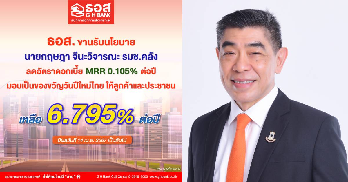 ธนาคารอาคารสงเคราะห์ (ธอส.) ขานรับนโยบาย นายกฤษฎา จีนะวิจารณะ รัฐมนตรีช่วยว่าการกระทรวงการคลัง ในการช่วยลดภาระค่าใช้จ่ายให้กับลูกค้าและประชาชน เพื่อมอบเป็นของขวัญวันปีใหม่ไทยให้กับลูกค้าและประชาชน ประกาศปรับลดอัตราดอกเบี้ยเงินกู้ MRR 0.105% ต่อปี มีผลตั้งแต่วันที่ 14 เมษายน 2567 เป็นต้นไป