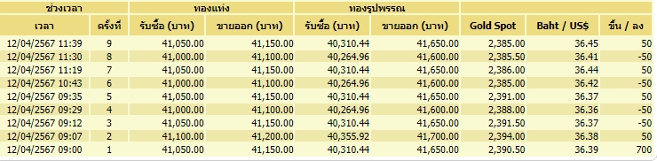 ตลอดครึ่งวันราคาเปลี่ยนแปลงไปแล้ว 9 ครั้ง ปรับเพิ่มขึ้นไปแล้ว 700 บาท โดยครั้งที่ 9 เมื่อเวลา 11.39 น. ทองแท่ง รับซื้อ 41,050 บาท ขายออก 41,150 บาท ทองรูปพรรณ รับซื้อ 40,310.44 บาท ขายออก 41,650 บาท