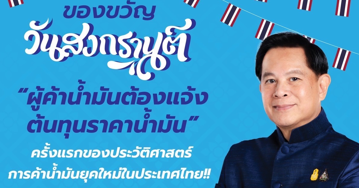 กรุงเทพฯ 13 เม.ย.- รมว.พลังงาน มอบของขวัญวันสงกรานต์ให้พี่น้องประชาชนด้วยการประกาศให้ผู้ค้าน้ำมันต้องแจ้งต้นทุนราคาน้ำมันให้กรมธุรกิจพลังงาน ก.พลังงาน ทราบทุกเดือน