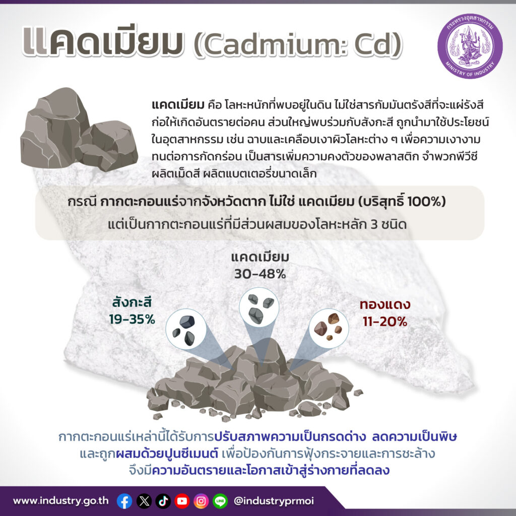 ดร.ณัฐพล รังสิตพล ปลัดกระทรวงอุตสาหกรรม เปิดเผยถึงความคืบหน้าการจัดการกากตะกอนแร่แคดเมียมของกระทรวงอุตสาหกรรม ประจำวันที่ 13 เมษายน 2567 ว่าได้รับรายงานจากศูนย์วิจัยและเตือนภัยมลพิษโรงงานของกรมโรงงานอุตสาหกรรม (ศูนย์วิจัยฯ กรอ.) ว่าผลการตรวจสอบตัวอย่างกากตะกอนแร่แคดเมียมที่เจอทุกจุด มีองค์ประกอบของธาตุทางเคมีตรงกันกับกากแร่จังหวัดตาก โดยไม่พบสารกัมมันตภาพรังสีและมีความชื้นเหลืออยู่เพียง 18% ส่วนแผนการขนย้ายกากฯ กลับสู่บ่อฝังกลบในจังหวัดตาก อยู่ระหว่างปรับปรุงรายละเอียดตามความเห็นของกระทรวงฯ ที่เกี่ยวข้อง เพื่อให้การขนย้ายเป็นไปอย่างปลอดภัย รวดเร็ว ถูกหลักมาตรฐานสากล