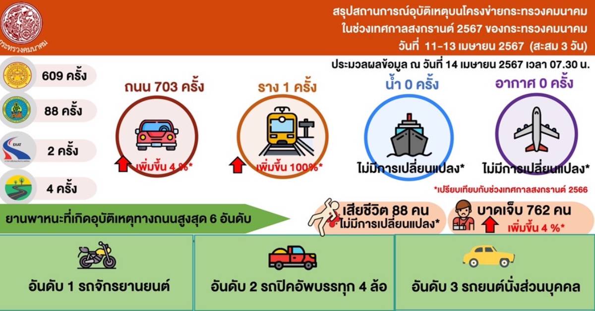 นายสุริยะ กล่าวต่อว่า สำหรับอุบัติเหตุบนโครงข่ายถนนของกระทรวงคมนาคม รวม 703 ครั้ง มีผู้เสียชีวิต 88 คน บาดเจ็บ 762 คน มูลเหตุสันนิษฐานสูงสุด คือ ขับรถเร็วเกินอัตรากำหนด 416 ครั้ง คิดเป็น 59% ยานพาหนะที่เกิดเหตุสูงสุด คือ รถจักรยานยนต์ 371 ครั้ง บริเวณที่เกิดเหตุสูงสุด คือ ทางตรง 502 ครั้ง คิดเป็น 71% จังหวัดที่มีผู้เสียชีวิตสูงสุด คือ นครราชสีมา 7 คน จังหวัดที่เกิดเหตุสูงสุด คือ กรุงเทพฯ 38 ครั้ง