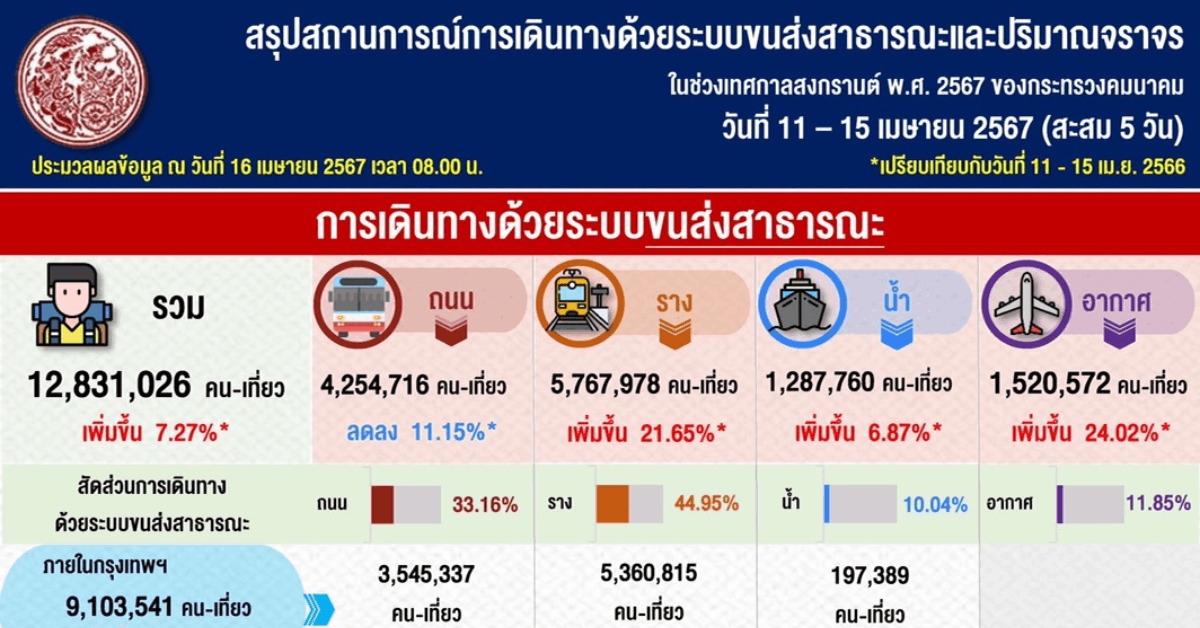 นายสุริยะ จึงรุ่งเรืองกิจ รัฐมนตรีว่าการกระทรวงคมนาคม เปิดเผยถึงภาพรวมเทศกาลสงกรานต์ 2567 ประจำวันที่ 15 เมษายน 2567 พบว่า ภาพรวมการเดินทางสะสม 5 วัน (11-15 เมษายน 2567) มีปริมาณการเดินทางโดยระบบขนส่งสาธารณะภายในประเทศและระหว่างประเทศ สามารถรองรับการเดินทางของประชาชนได้อย่างเพียงพอ โดยยังคงเพิ่มขึ้นอย่างต่อเนื่อง อยู่ที่ระดับ 12,831,026 คน-เที่ยว เพิ่มขึ้น 7.27% เมื่อเทียบกับช่วงเดียวกันของปี 2566 โดยระบบการขนส่งสาธารณะภายในประเทศ ระบบรางมีการใช้บริการสูงสุด คิดเป็นสัดส่วน 44.95%