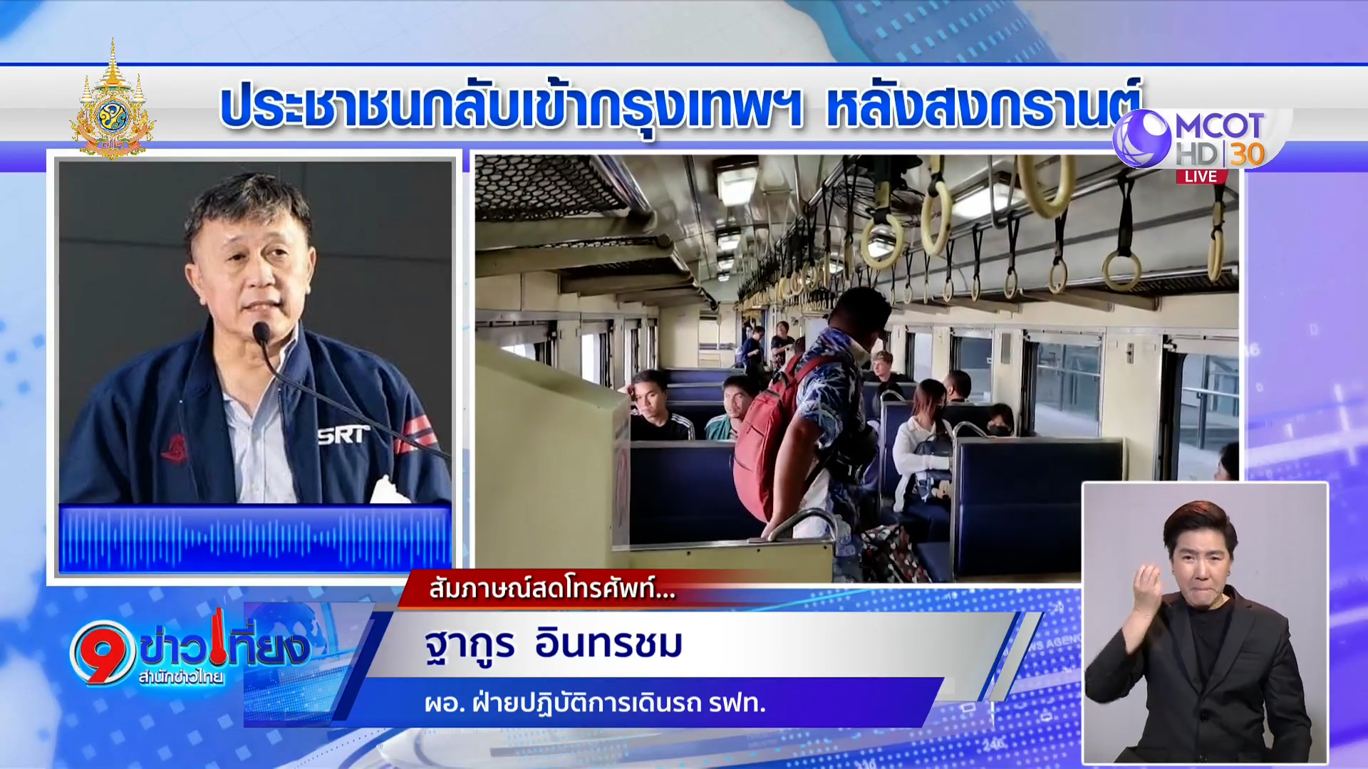 นายฐากูร อินทรชม ผอ.ฝ่ายปฏิบัติการเดินรถ การรถไฟแห่งประเทศไทย ให้สัมภาษณ์ผ่านรายการ “9ข่าวเที่ยง” สำนักข่าวไทย ถึงบรรยากาศการใช้บริการรถไฟขาเข้ากรุงเทพฯ โดยช่วงเช้าวันนี้ มีผู้ใช้บริการค่อนข้างเยอะ โดยวันนี้จะมีรถขบวนพิเศษ รองรับผู้โดยสารเดินทาง สำหรับยอดการเดินทางขาเข้ากรุงเทพฯ เมื่อวานนี้ (15 เม.ย.) ประมาณ 4 หมื่นคน ส่วนวันนี้คาดว่าจะมีผู้ใช้บริการ 5-6 หมื่นคน (รวมผู้โดยสารเดินทางทั้งประเทศ) .-สำนักข่าวไทย