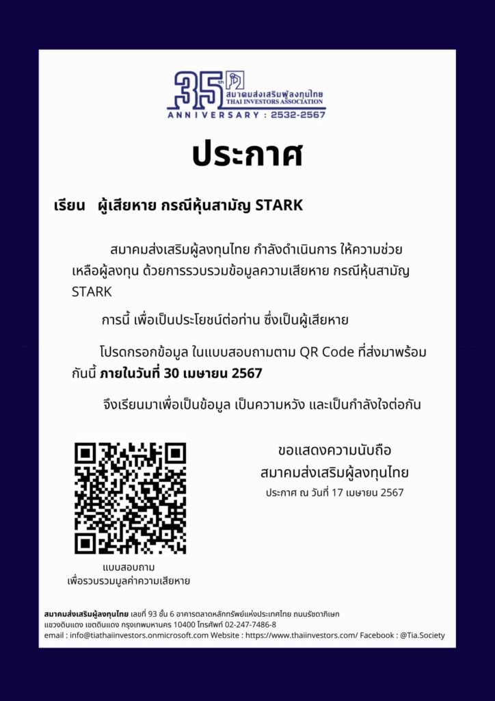 สมาคมส่งเสริมผู้ลงทุนไทยกำลังดำเนินการให้ความช่วยเหลือผู้ลงทุน ด้วยการรวบรวมข้อมูลความเสียหาย กรณีหุ้นสามัญ บริษัท สตาร์ค คอร์เปอเรชั่น จำกัด (มหาชน) หรือ STARK