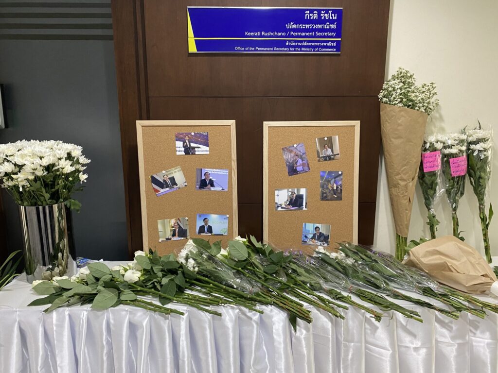 ผู้สื่อข่าวรายงานบรรยากาศภายในบริเวณหน้าห้องทำงานชั้น 10 สำนักงานปลัดกระทรวงพาณิชย์ โดยมีการจัดวางรูปภาพนายกีรติ รัชโน ปลัดกระทรวงพาณิชย์ที่ได้เสียชีวิตอย่างกระทันหันเมื่อวันที่ 19 เมษายนที่ผ่านมาและในบริเวณติดกันได้ตั้งโต๊ะพร้อมสมุดและมีดอกไม้มาวางไว้ให้เหล่าข้าราชการในสังกัดกระทรวงสามารถมาเขียนข้อความระลึกถึงคุณงามความดีของท่านปลัดพาณิชย์อีกด้วยและในช่วงเย็นจะมีพิธีรดน้ำศพและพิธีบำเพ็ญกุศลสวดพระอภิธรรมนายกีรติ รัชโน ปลัดกระทรวงพาณิชย์ ณ ศาลาสารัชถ์-นลินี รัตนาวะดี ฌาปนสถานกองทัพอากาศ วัดพระศรีมหาธาตุวรมหาวิหาร เขตบางเขน กรุงเทพมหานคร แต่เนื่องจากนายกีรติ รัชโน ได้อุทิศร่างกายเพื่อการศึกษาทางการแพทย์แก่นักศึกษาแพทย์ ณ สถาบันการแพทย์จักรีนฤบดินทร์ คณะแพทยศาสตร์โรงพยาบาลรามาธิบดี มหาวิทยาลัยมหิดล ทำให้กำหนดงานครัังนี้ จะไม่มีการนำร่างมาประกอบพิธี แต่จะใช้ผมและเล็บลากสายสิญจน์รดน้ำแทน