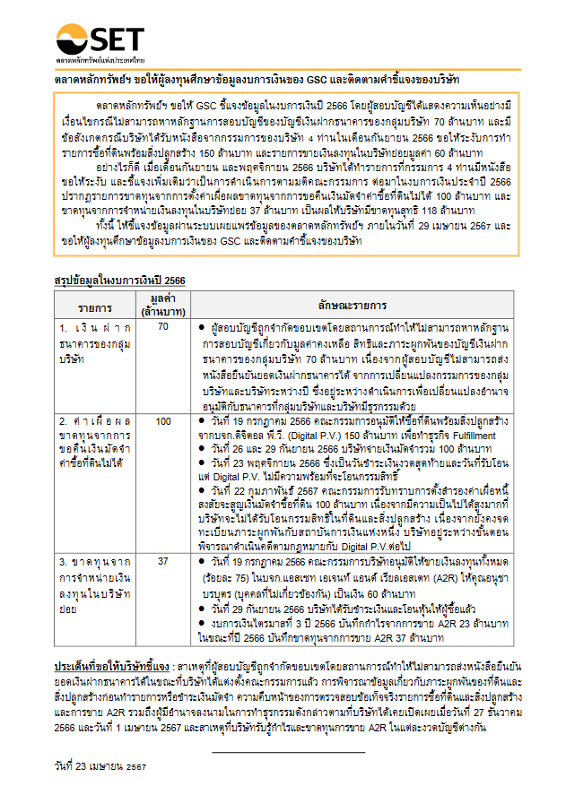 ทั้งนี้ ให้ชี้แจงข้อมูลผ่านระบบเผยแพร่ข้อมูลของตลาดหลักทรัพย์ฯ ภายในวันที่ 29 เมษายน 2567 และขอให้ผู้ลงทุนศึกษาข้อมูลงบการเงินของ GSC และติดตามคำชี้แจงของบริษัท. -511 สำนักข่าวไทย